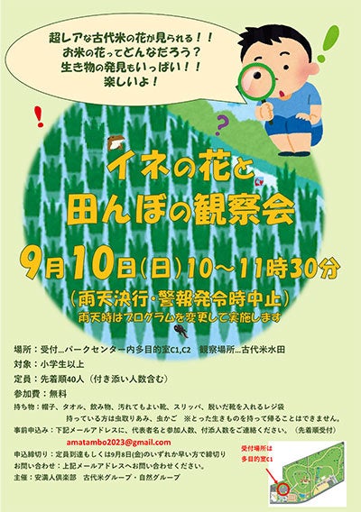 古代米は8月中頃から赤や紫がかった黒の稲穂が顔を出します。一つの穂には100個くらいの小さな花(えい花)が集まっていて、えい花の中からおしべが出てきてそれが白い花のように見えます。花は晴れた日の午前10時頃から数時間ほどしか咲かず、なかなか見ることができないため、花を観察できる機会は大変貴重です。あわせてカエル、オタマジャクシ、ヤゴなど田んぼに住む生き物探しも同時開催します。ぜひイベントにお越しください。