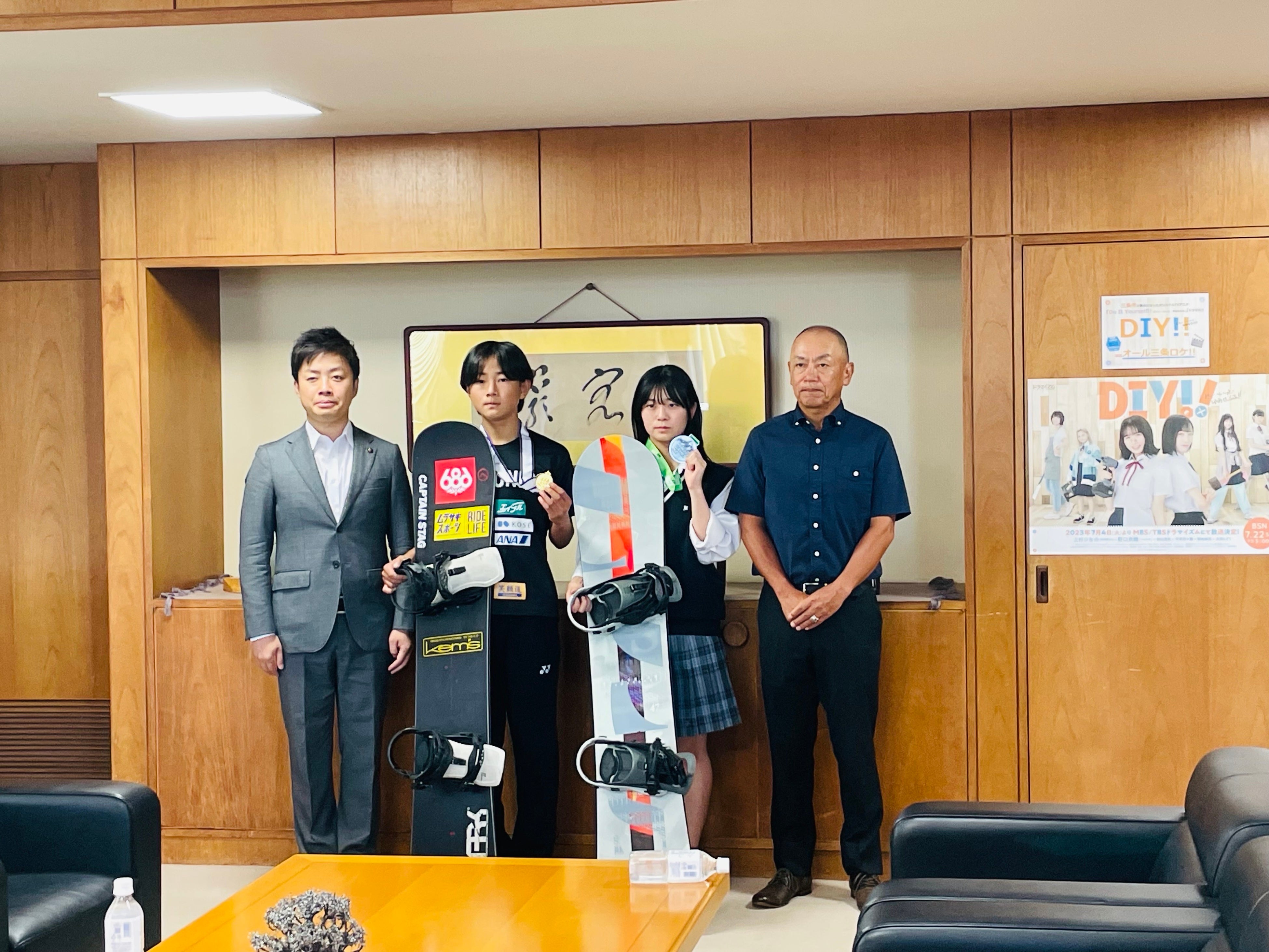 8月9日、オールアルビレックス・スノーボードアカデミー所属の村上 広乃輔選手(本成寺中2年)、山崎 月選手(開志国際高3年)が三条市長を表敬訪問をしました。