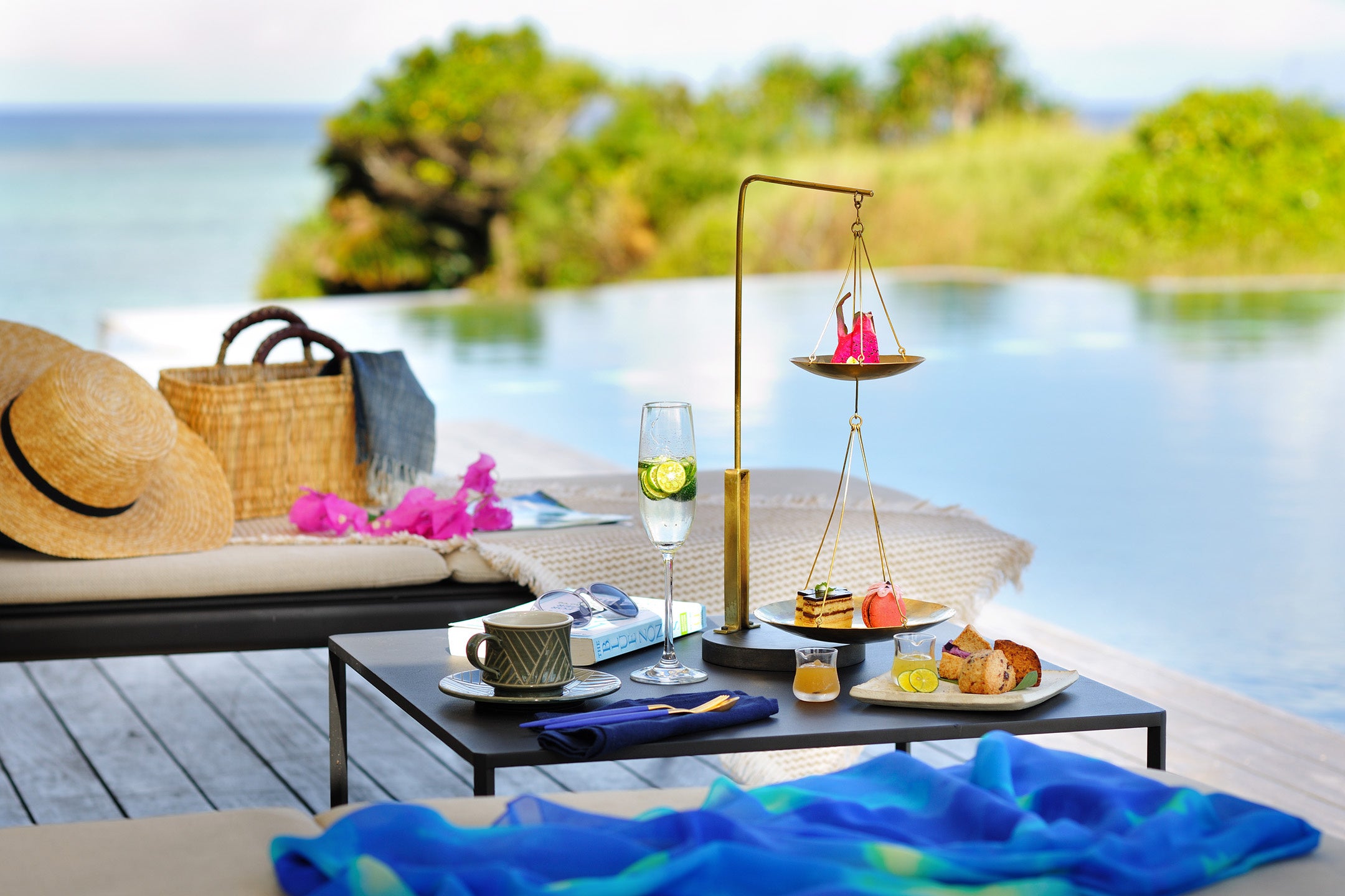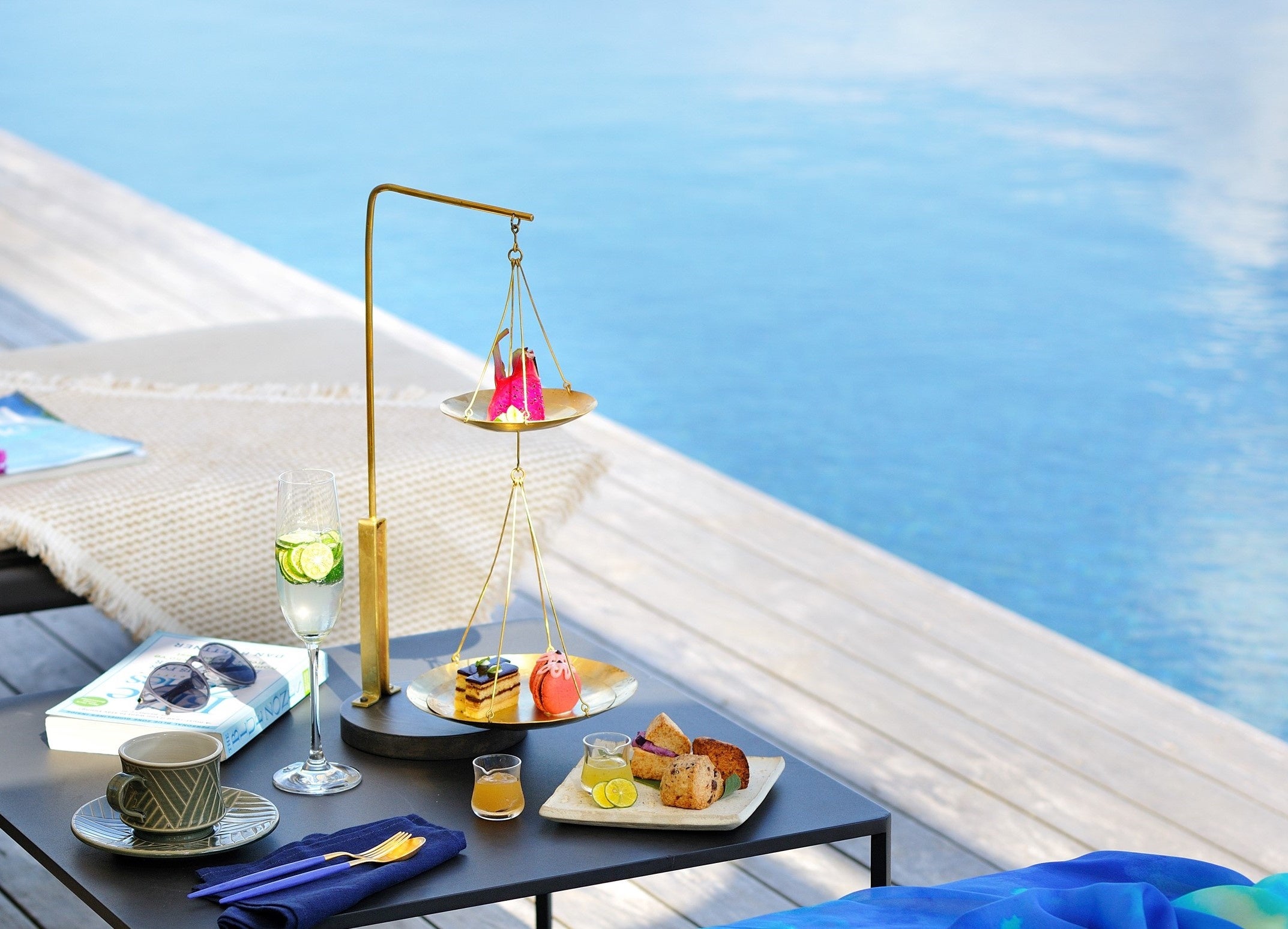海に臨むプールサイドで爽やかな風を感じながら味わう、アフタヌーンティー