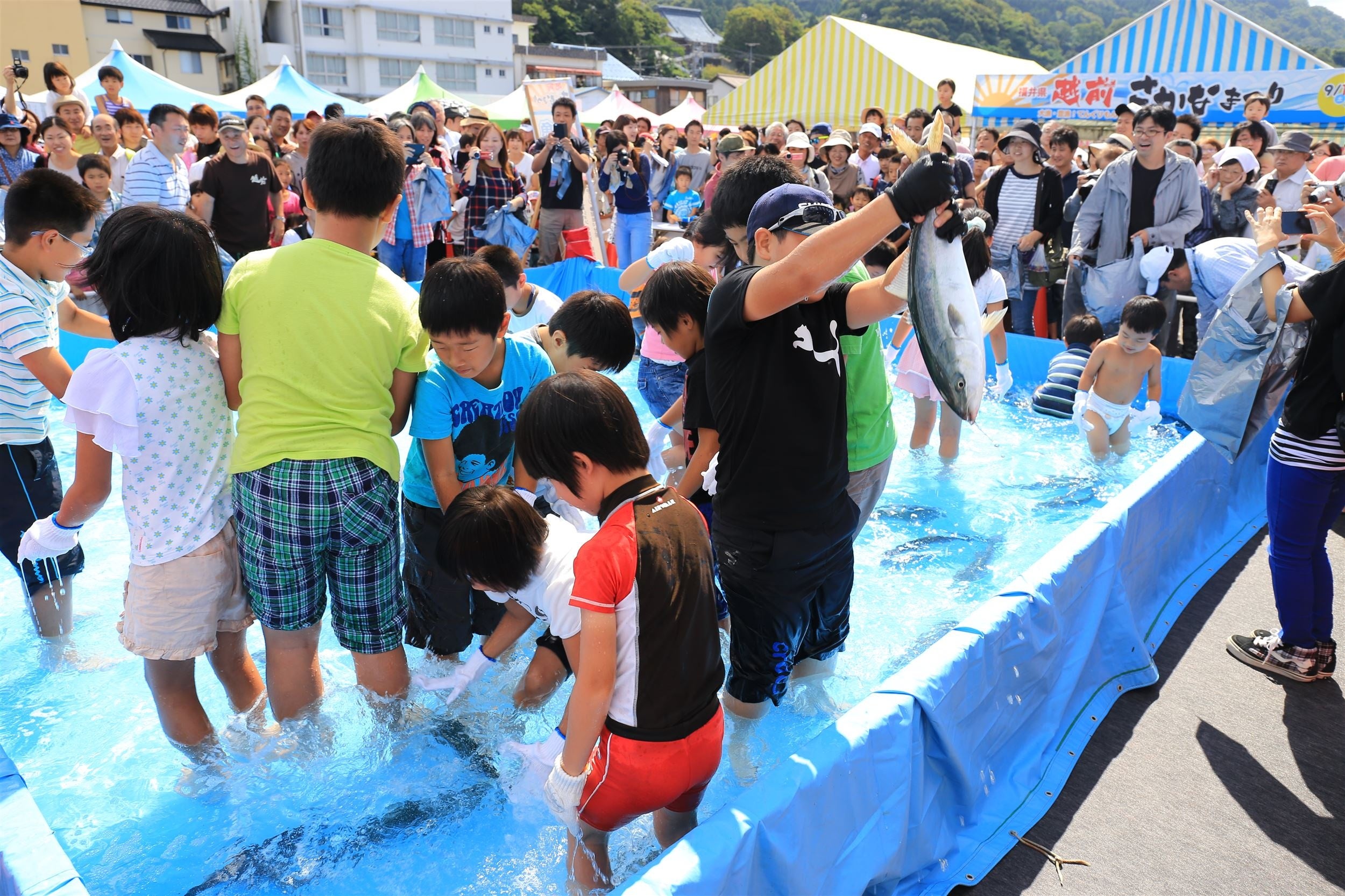 漁師になろう体験と銘打つ「魚のつかみ取り体験」や「漁船乗船体験」などの体験企画、お魚とふれあえるふれあい水族館や、獲れたてピチピチの海産物の即売市や海鮮グルメなどおさかな尽くしの2日間です。