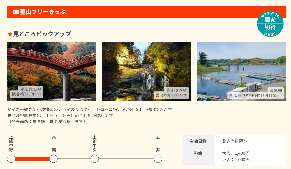 高滝湖グランピングリゾートでは宿泊者限定で「里山フリーきっぷ」をお買い求め頂けます。小湊鐵道としては駅以外で「里山フリーきっぷ」を販売するのは初の試みとなります。市原市を漫喫しながら、小湊鐵道沿線から見られる景色が堪能できます。