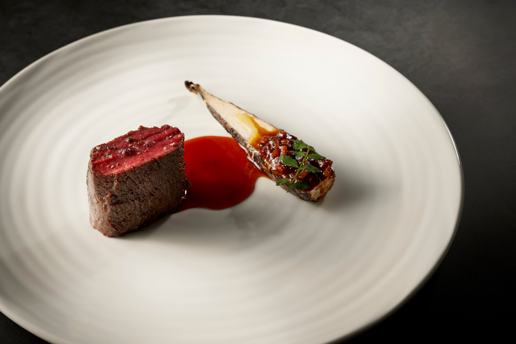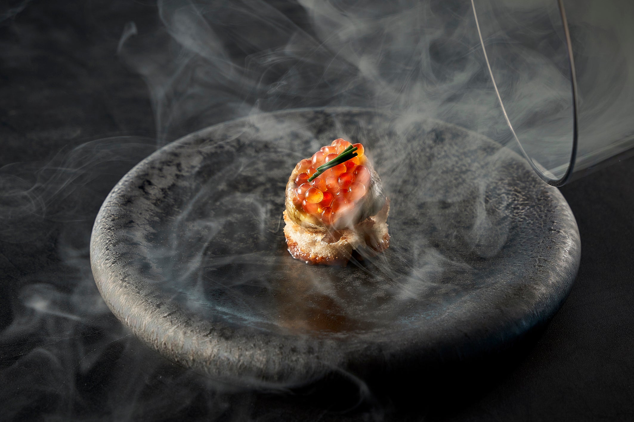 同じく33階に位置し、フレンチベースの料理を独自の燻製技術でアレンジした独創的なメニューを提供する「燻製キッチン」では、高層階のレストランすべてを統括するヘッドシェフ・浅野裕之が手掛ける旬の味覚をお楽しみいただけます。9月から登場する秋のメニューは、秋鮭漁がピークのこの時期に旬を迎えるいくらに燻香をつけ秋茄子にトッピングした一品や、薫り高いキノコスープ、炙った舞茸とクリスピーポークベリーを乗せたそば粉のガレットなど、前菜から季節を濃厚に感じるメニュー構成となっています。中でも注目はメインでご提供するジビエとして人気の鹿肉のグリルです。シェフ浅野は日本各地からその時々の仕入れ状況によって最も質の良い食材を使うことにこだわっていて、鹿肉の産地には奈良の吉野も含まれます。世界遺産として登録されている吉野山で育った鹿は肉質が良く、また狩猟後すぐ丁寧に処理されるため臭みがないのが特徴です。他にも宮﨑の豊かな自然で育った鹿肉も評価が高く、これらの鹿肉を炭火で炙ってしっかりと燻製の香りをつけます。添えられたマコモ茸の炭火焼、山椒の香る鹿のソースと共に芳醇な香りと旨味をお楽しみください。