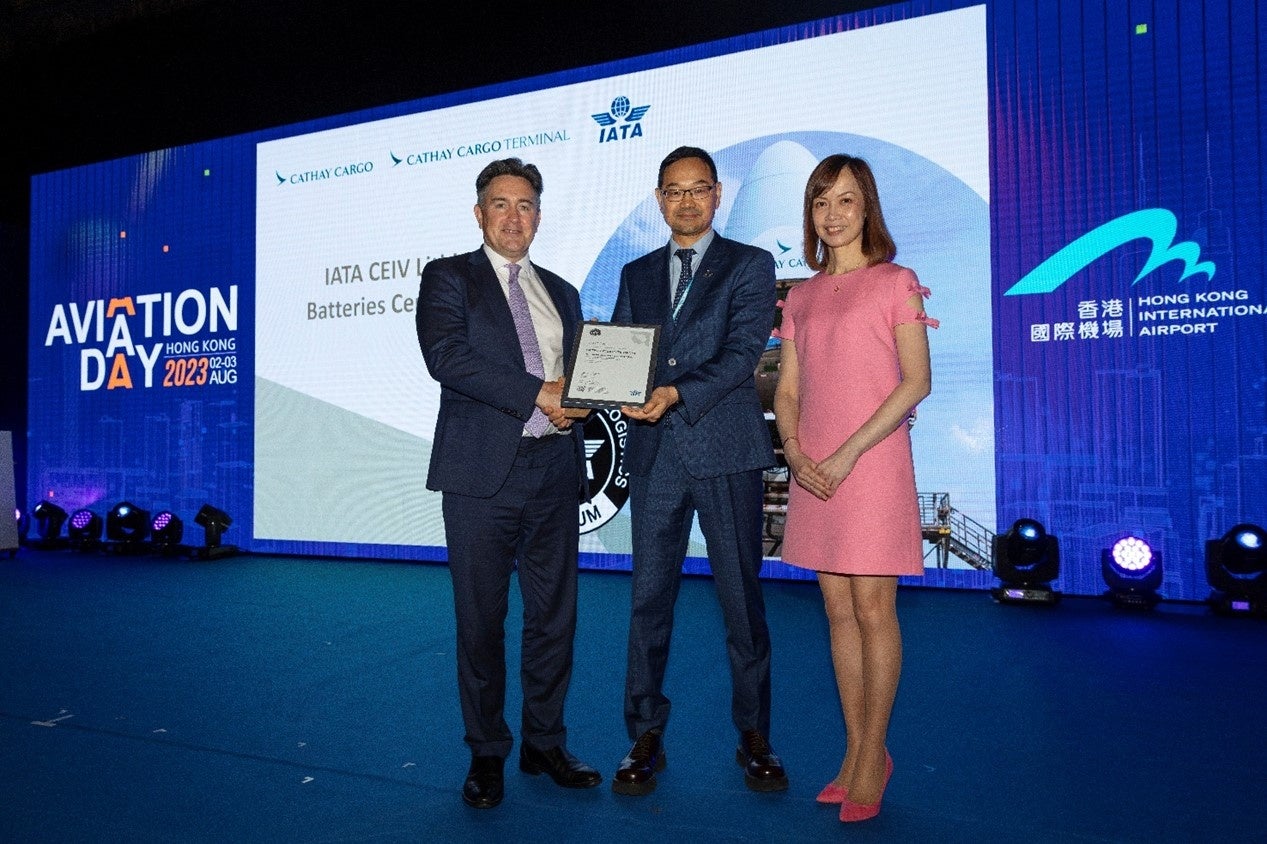<画像:IATA北アジア地域担当バイス・プレジデント シェ・シンクワン博士(中央)からキャセイパシフィック航空 チーフ・カスタマー&コマーシャル・オフィサー ラヴィニア・ラウ(右)とカーゴ・ディレクター トム・オーウェン(左)にIATAが定める「CEIVリチウム電池認証」(CEIV Li-batt)が授与されました。>