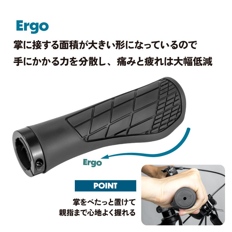 [エルゴデザイン]長時間のライディングに向いているエルゴ形状は、手首や掌の疲れの軽減と高いフィット感が期待できます。