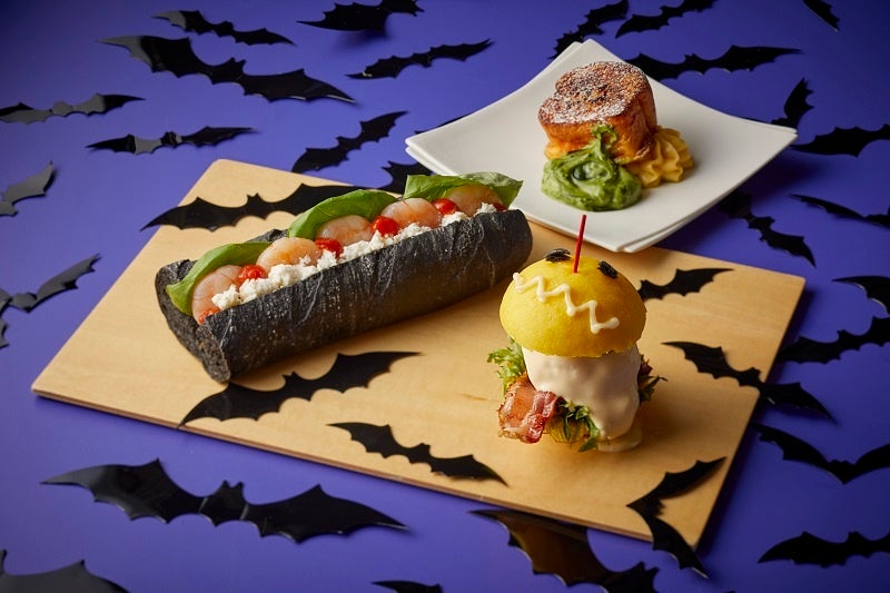 コラボメニューでは、紫いもをねりこんだバンズと肉汁溢れるパティに濃厚なチーズフォンデュソースをたっぷりとかけた「絶品パティと濃厚チーズ×紫いもバンズのチーズフォンデュバーガー」(右下)や香ばしい匂いが食欲をそそる「暗黒のソフトバゲット×シチリア風SABAサンド」(左)がラインナップ。ビュッフェ限定の生食パンはほうれん草とにんじんでご用意いたします。「ブレッドバラエティ~小さなモンスター~」では、トリッパのトマト煮込みやかぼちゃサラダなどちょっと変わったメニューでハロウィンらしさを表現しました。