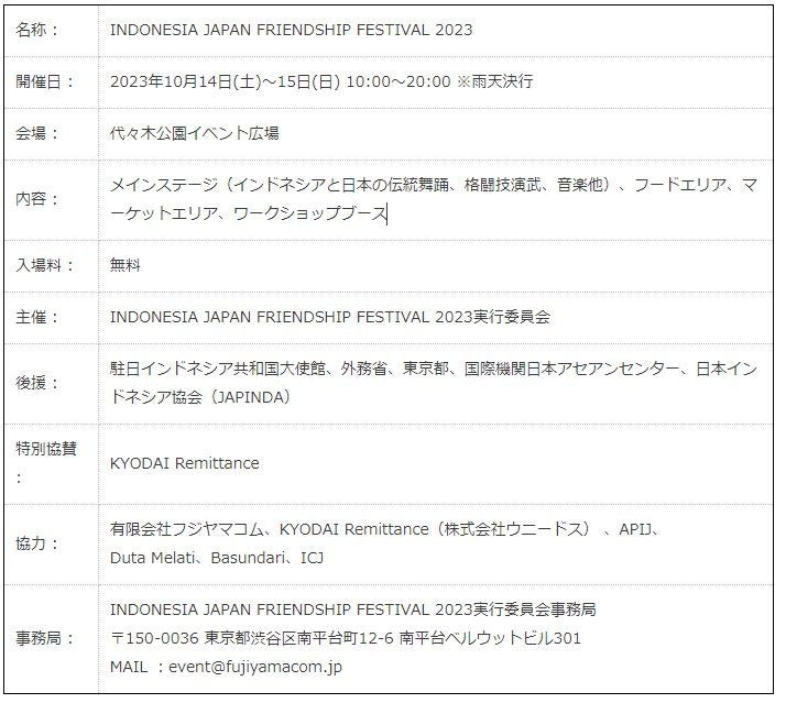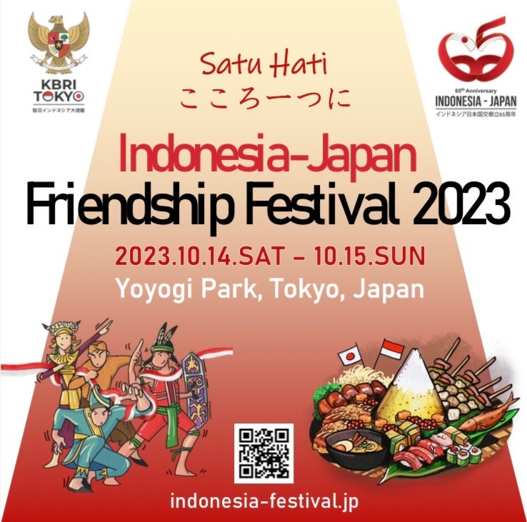 駐日インドネシア共和国大使館は、実行委員会の協力により、「INDONESIA JAPAN FRIENDSHIP FESTIVAL 2023」が開催されることを誇りに感じております。