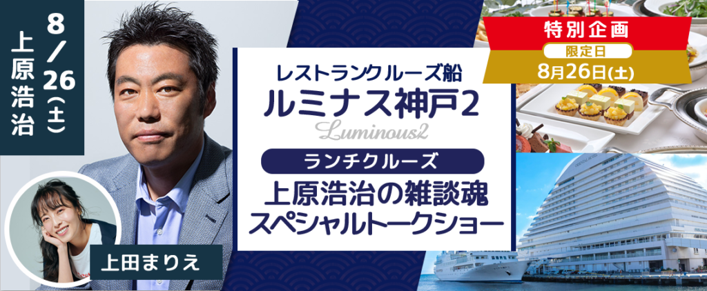 8月26日(土)開催! ルミナス神戸2 「上原浩治の雑談魂スペシャルトークショー」トークショーのみB席お一人様¥9,000-から 〜明石海峡大橋ランチクルーズ〜