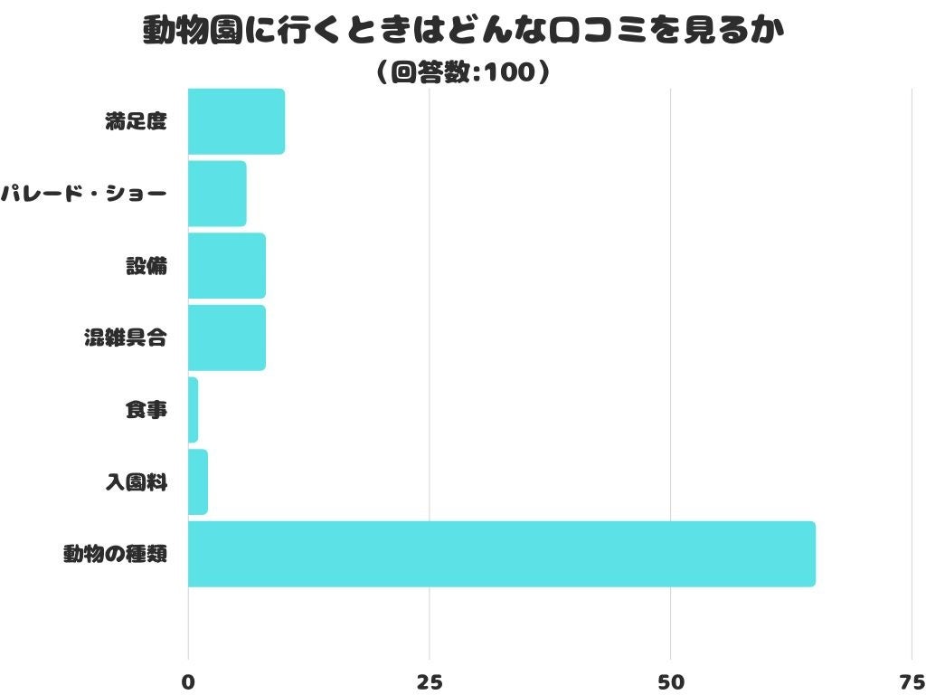 動物園のどんな内容の口コミを参考にするかをアンケートにて調査したところ、1位は「動物の種類」でした。