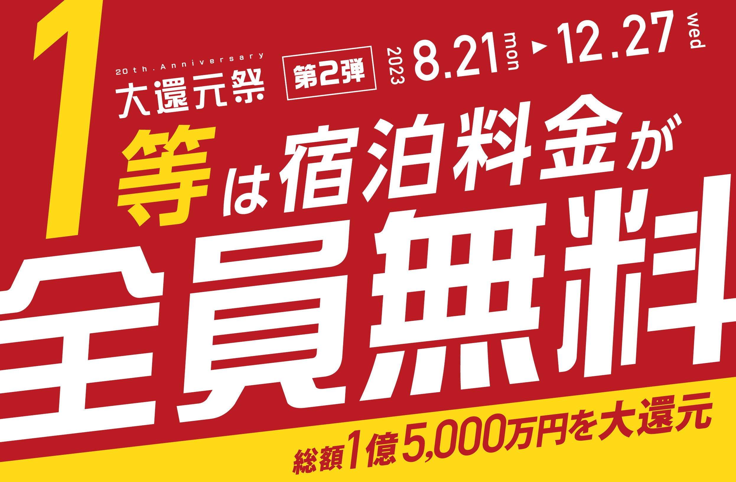 湯快リゾートは、石川県山代温泉に最初の温泉リゾートホテルを開業して、2023年9月に20周年を迎えます。20周年という節目において、ご愛顧いただいたお客様に感謝の気持ちを込めて「20周年大還元祭第2弾」をスタートいたします。