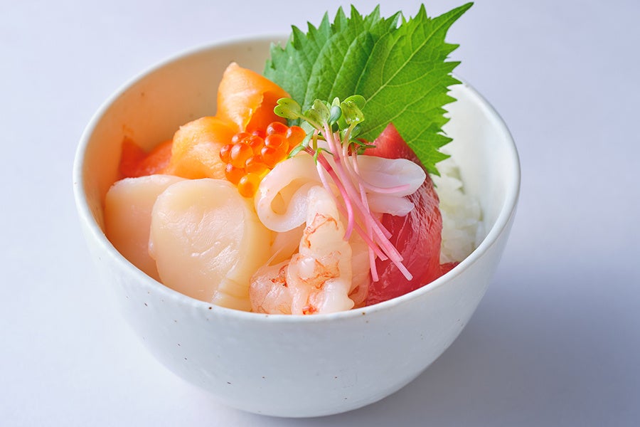 海鮮丼 / チキンハーブロール / ホワイトコーンのパンナコッタ / イタヤ貝とキノコのアンチョビオイルドレッシング / 鮭テリーヌ / 生ハムとロマネスコ 四種の北海道産チーズソース など