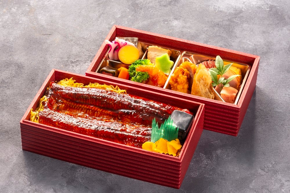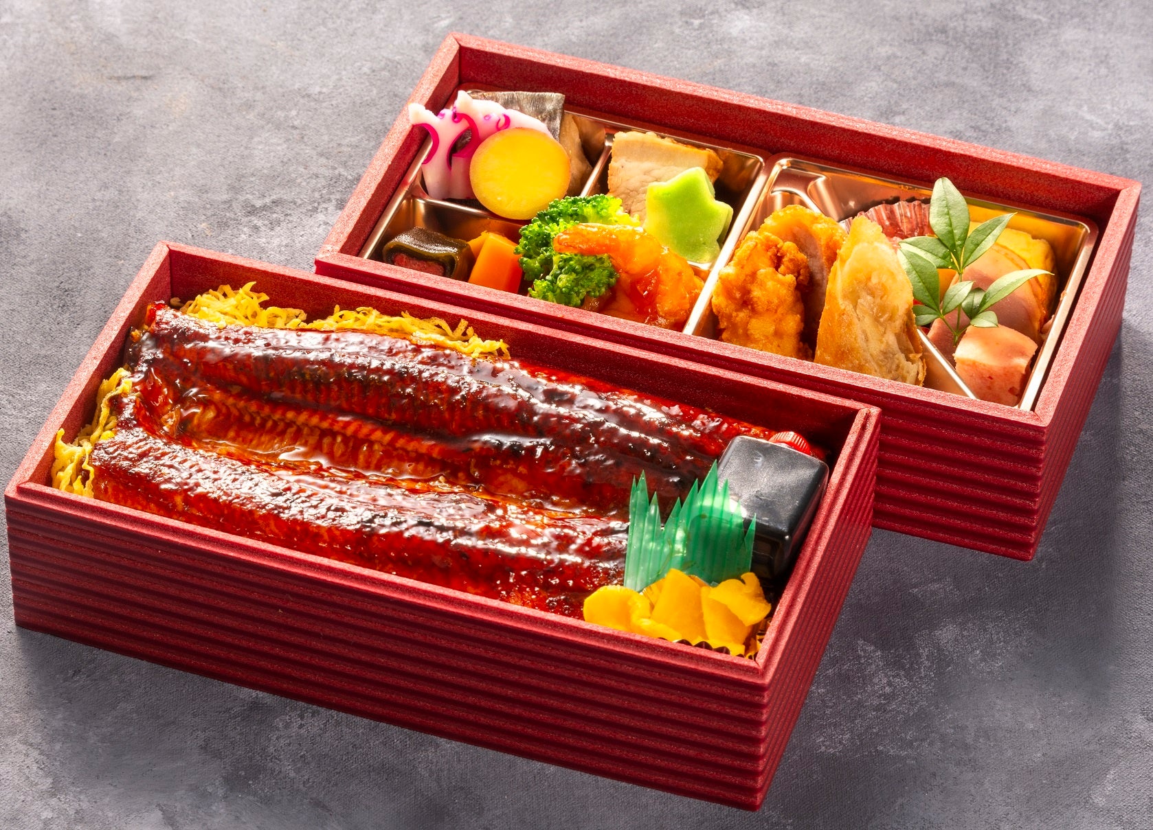 上段には彩り豊かな四季折々の食材を詰め込み、下段には柔らかくふっくらと仕上げたうな重を。