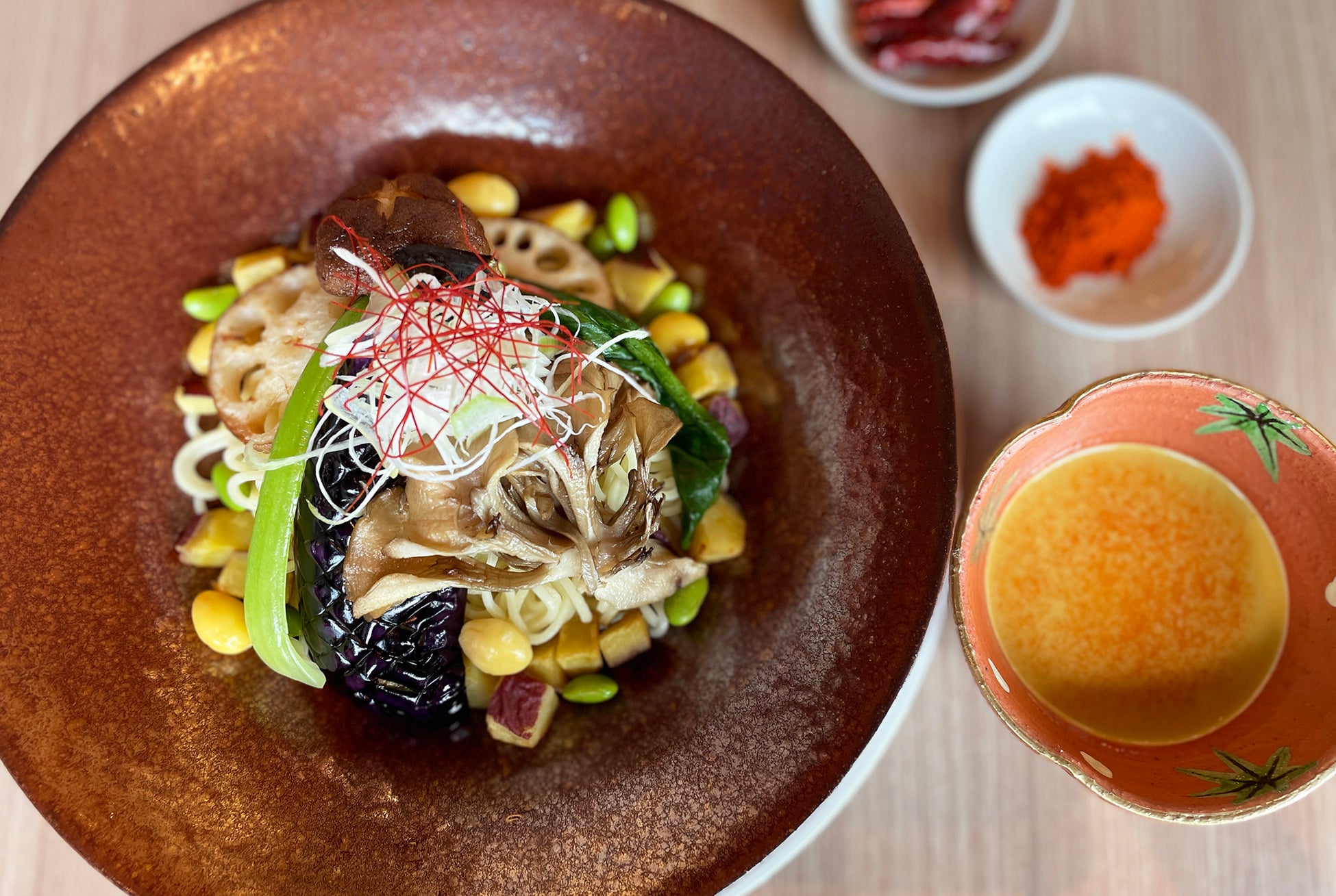 夏季限定メニューとして好評の「冷やし担々麵」。厳しい残暑が続きそうな9月より、秋バーションで新登場いたします!コクと旨味が特長の胡麻スープと、甘辛く味付けした肉味噌、添えられた野菜を冷麺と一緒に混ぜながらお楽しみいただく逸品です。しっかりとしたボリュームの具材は、茄子、きのこ、銀杏、さつま芋など、一足早く“秋”のイメージに!ツルリとした食感の冷麺を、こだわりの自家製ラー油の味わいと共に、ご堪能いただけます。また、お客さまのご要望に応じて、辛さは3段階。その日の気分やお好みで、ノーマル・中辛・大辛よりお選びください。