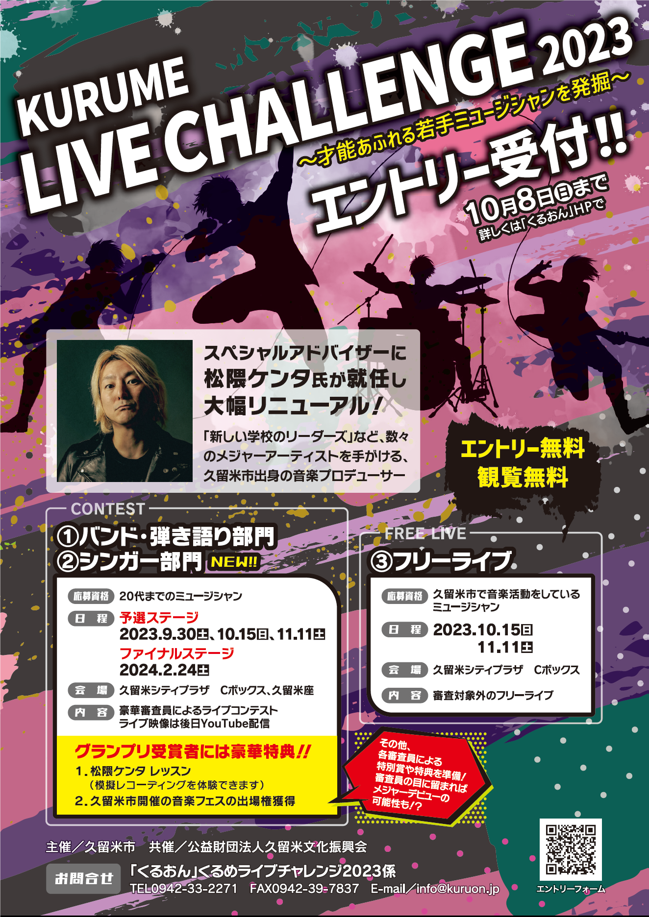 20代までのアマチュアミュージシャンを対象に、豪華審査員を招いたライブコンテストを開催します。グランプリ特典として松隈ケンタによるレッスンや、市主催の音楽フェスへの出場権獲得があります。他にも審査員特別賞を準備し、メジャーデビューの可能性も。出場者随時受け付け中。最終エントリー締め切りは10月8日。