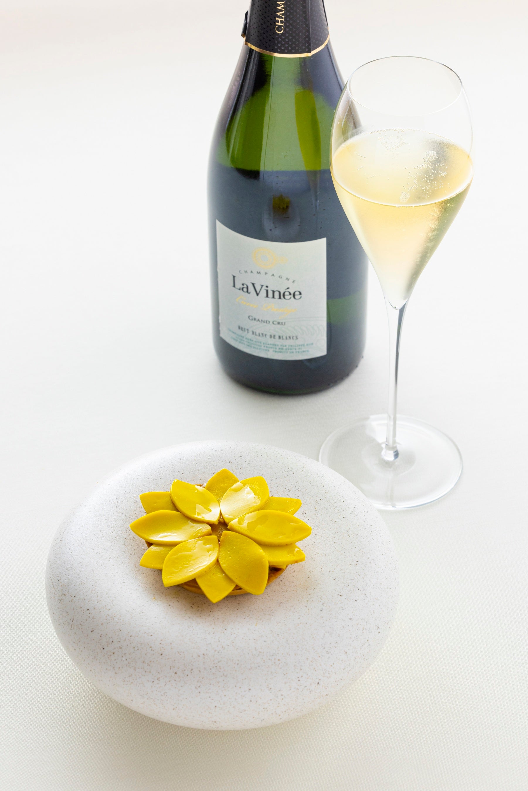 「アカヤマドリと毛ガニのタルト」では、瓶で8年熟成させたシャンパン「ラ・ヴィネ・キュヴェ・プレステージ ブリュット・ブラン・ド・ブラン・グラン・クリュ」を合わせました。モクテルはリンゴと洋ナシの果汁を煮詰めて炭酸で割り、熟成したシャンパンを意識した仕上げになっています。