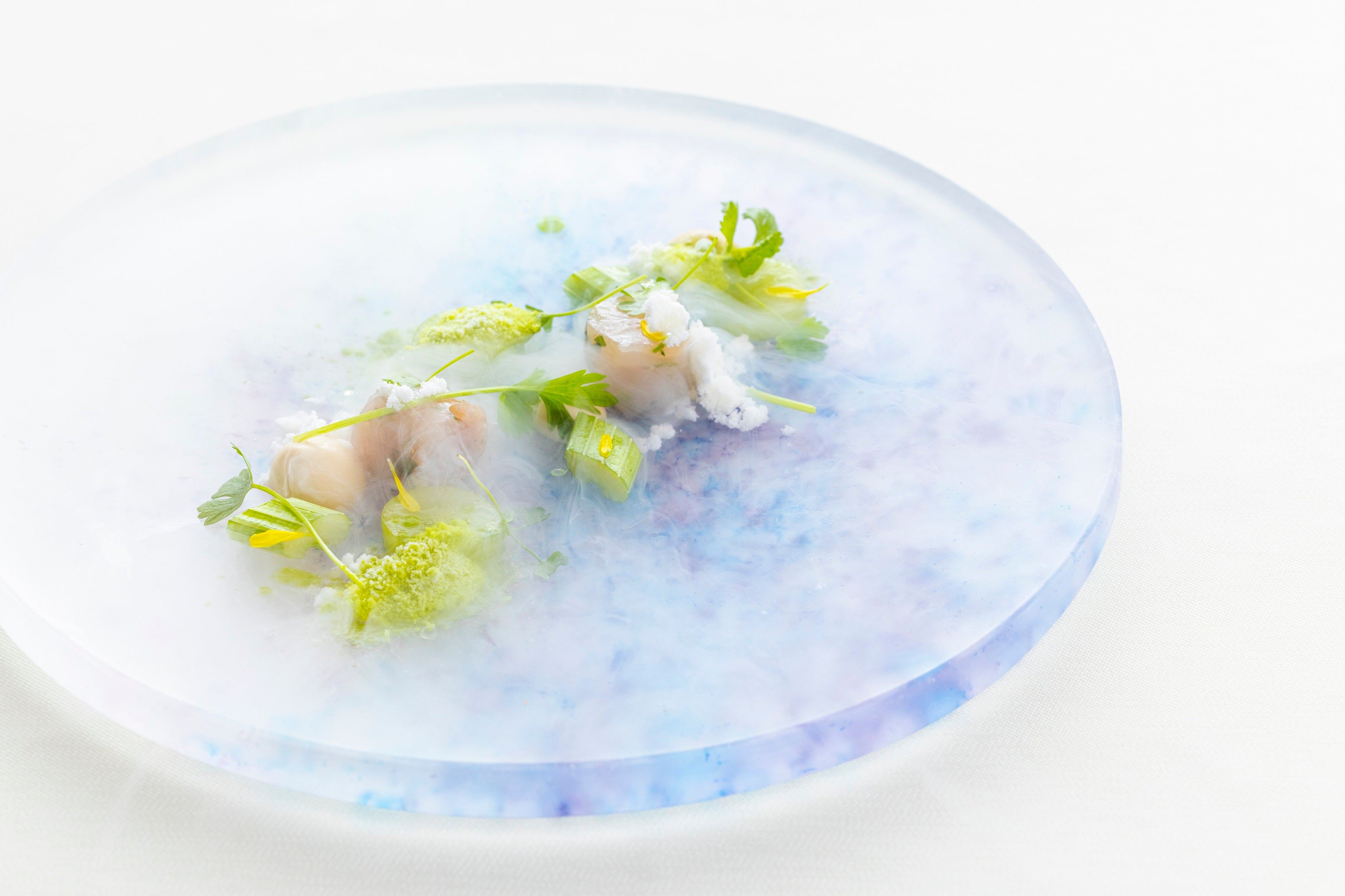 信州で古くから食されている鯉。ユカワタンでは一年を通して提供しています。「鯉のコントラスト」では、2週間熟成させた鯉と、血抜きをした鯉の2種類を味わえます。シャインマスカット、エルダーフラワー、グレック(マリネ)やパウダーアイスにしたセロリなど、青い香りを合わせた夏らしく涼しげな前菜です。