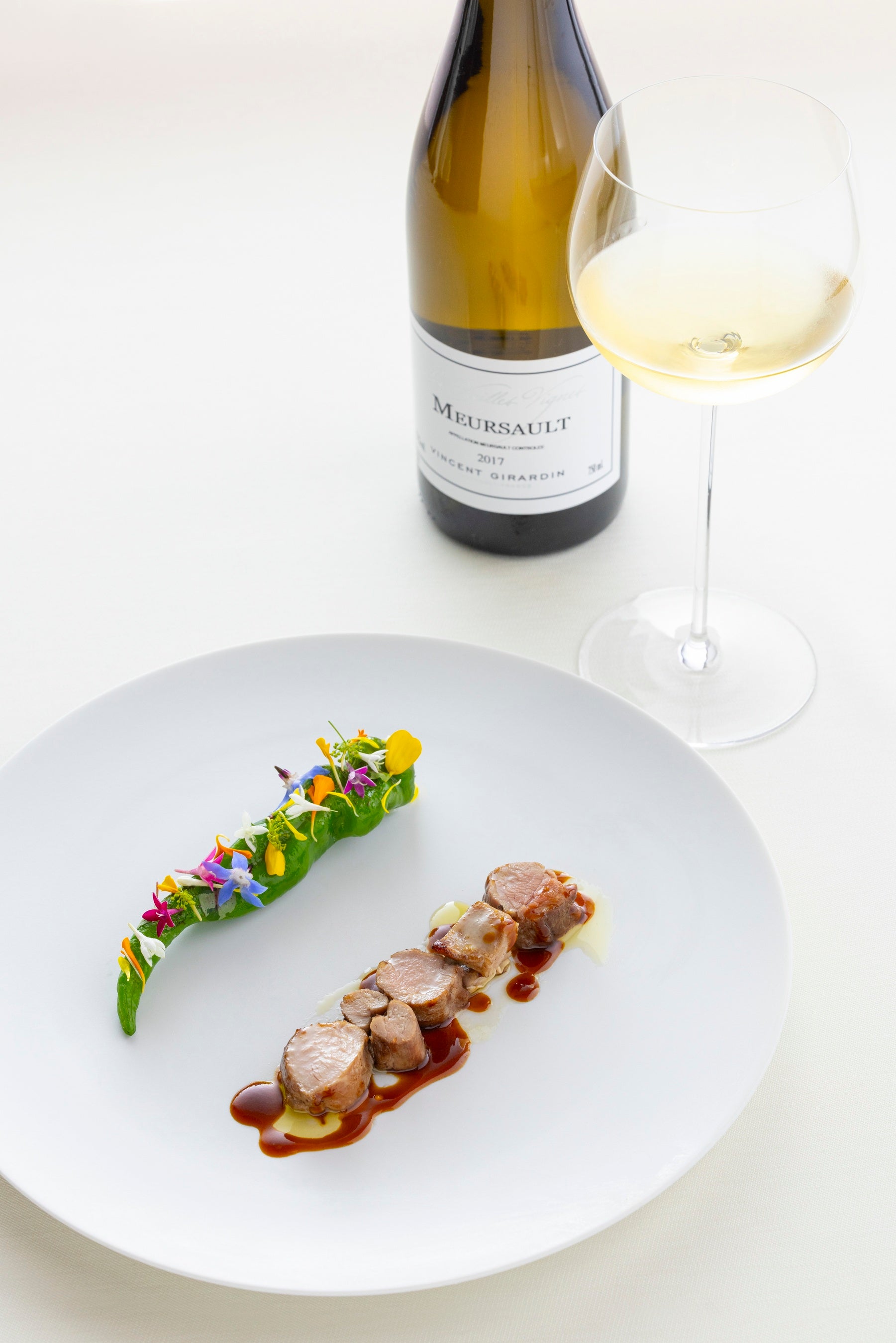「乳飲み仔山羊ロティ ソースエキゾチック」のペアリングは、ヴァンサン・ダンセールの「ムルソー ブラン レ・ヴィエイユ・ヴィーニュ2017」を。古い樹齢の葡萄をブレンドし、複雑さの中にバランスの良さを実現しています。モクテルはレモンバーベナやタイムなどのハーブに、アルコールを飛ばした白ワインと合わせた清涼感ある味わいです。
