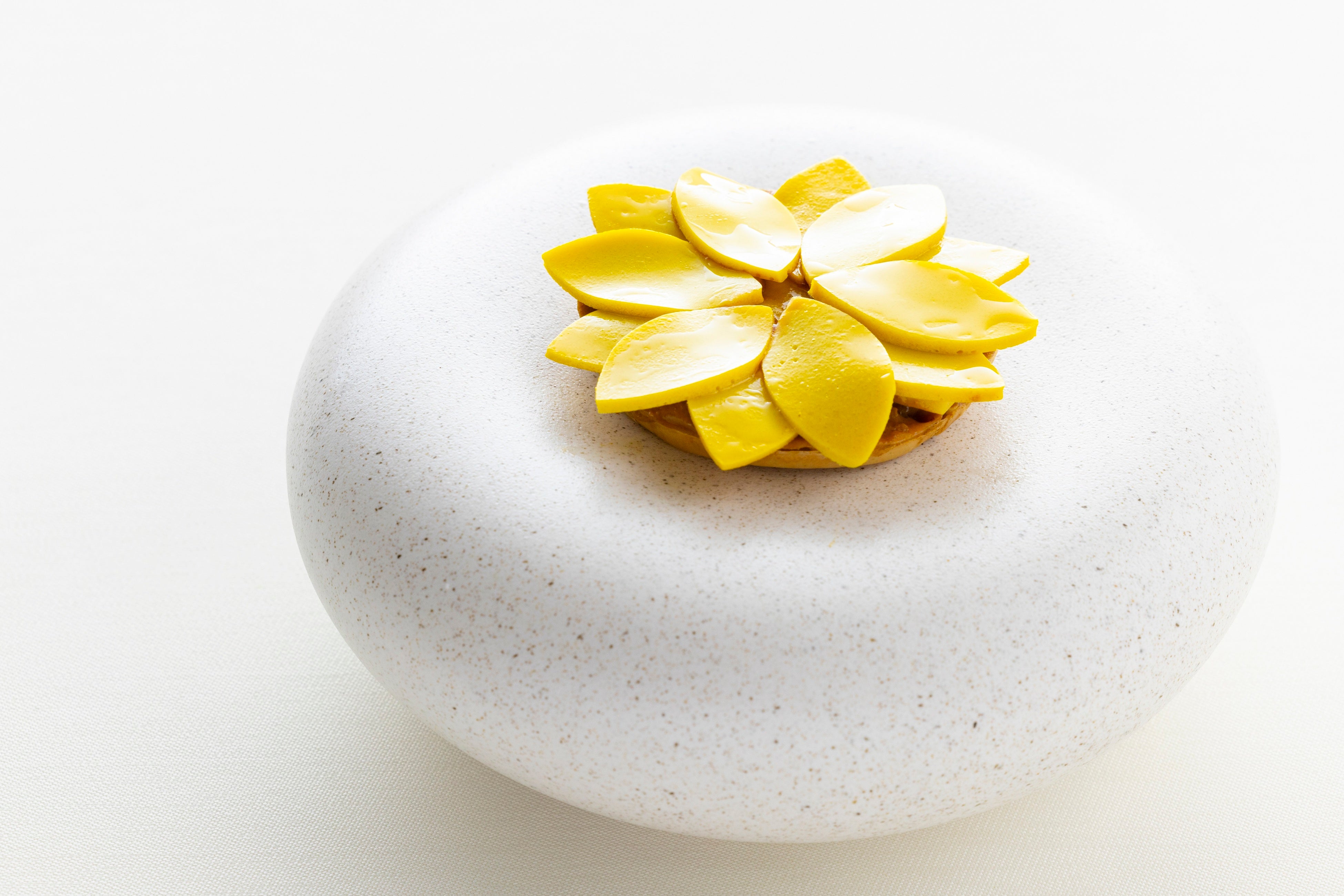 アカヤマドリは、夏から秋頃に発生する茸です。大きなものは20~30cmになります。食べ頃を迎えたアカヤマドリは味が強く、「アカヤマドリと毛ガニのタルト」では、毛ガニと合わせてさらに旨味を凝縮させました。薄く焼いたタルト生地に包まれていて、手で摘まんで食べるスタイルです。