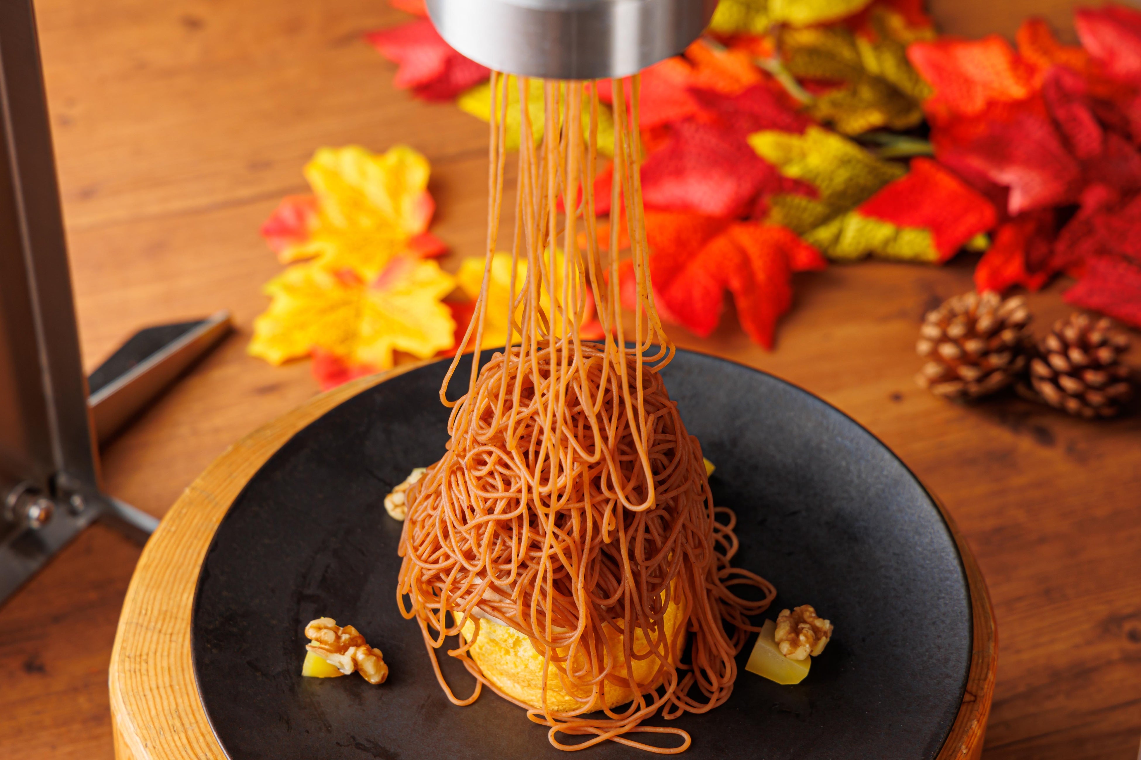 デザートコーナーには、「栗」や「さつま芋」をチョコレートに絡める「チョコレートファウンテン」や、旬のシャインマスカットを使った「シャインマスカットのミニタルト」などが並びます。さらにオープンキッチンで提供する「モンブランシャワー」は、お客様の目の前でモンブランクリームを絞って仕上げます。