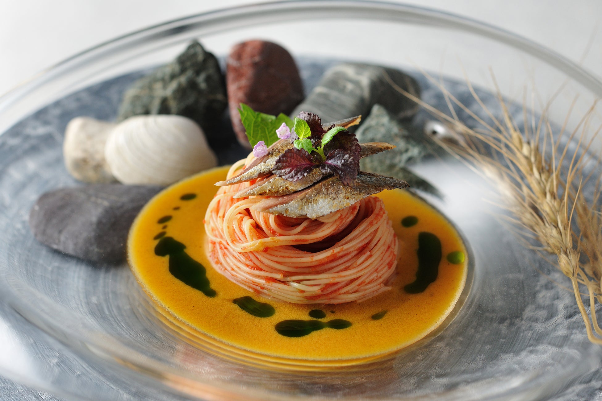 秋の味覚、秋刀魚の旨味を存分に味える冷製パスタを提供します。秋刀魚をまるごと使用した濃厚なスープは、脂がのった身と内臓や骨のほのかな苦味が特徴です。パスタはトマトのピューレを絡め、大葉をトッピングしてさっぱりとした味わいに仕上げました。秋刀魚のスープと合わせることで、トマトの甘みがより一層引き立ちます。秋刀魚の旨味と、トマトの爽やかな味わいの調和を楽しめる一品です。