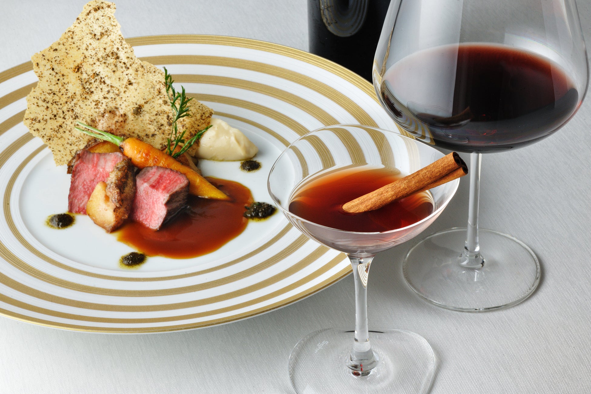ミックスペアリングでは、メインの「牛フィレ肉と鮑のアロースト」で、アルコール、ノンアルコールどちらのペアリングも楽しめます。アルコールは「ピノ・ネーロ2014 (ブレッサン)」を合わせ、ワインのふくよかな果実味と芯のある味わいが牛肉の赤身の旨味を引き立てます。ノンアルコールは、ごぼう茶をベースに葡萄、柘榴(ざくろ)やスパイスで仕上げた「ごぼう茶のモクテル」です。赤ワインの特徴に近い風味のごぼう茶や、葡萄、柘榴の果実味がお肉の旨味を包み込むような味わいを楽しめます。