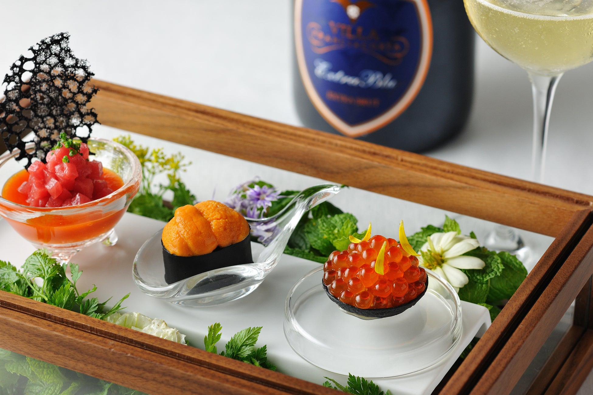 はじまりの一品は海鮮と秋の野菜を堪能できる 3 種類の料理が並びます。ウニの軍艦は、貝を使用したペーストを海苔に見立て、パリッと焼き上げました。酢飯の代わりに敷き詰めたゆり根のペーストが、濃厚なウニの味わいを引き立てます。イクラのタルトは、竹炭を練りこんだ黒いパイ生地に、いくらと生姜の風味がきいた茄子を盛り付けました。マグロのタルタルは、ピリッとした香味料で味付けしたパプリカがアクセントとなり、マグロの甘味を引き立てます。