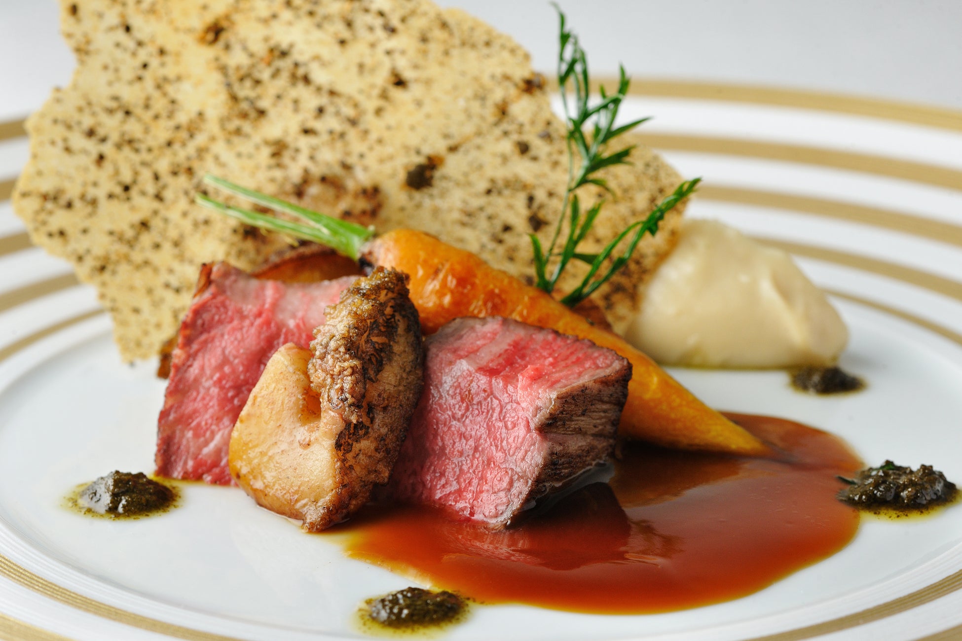 肉料理「牛フィレ肉と鮑のアロースト」×ピノ・ネーロ2014 (ブレッサン)×ごぼう茶のモクテル