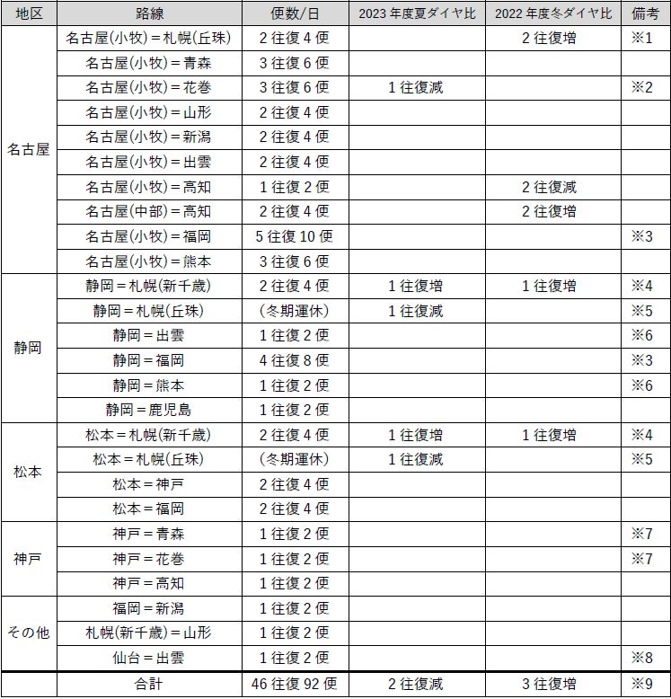 ※9 『神戸=新潟』線(1往復/日)につきましては、2023年8月20日をもって運航を終了いたしました