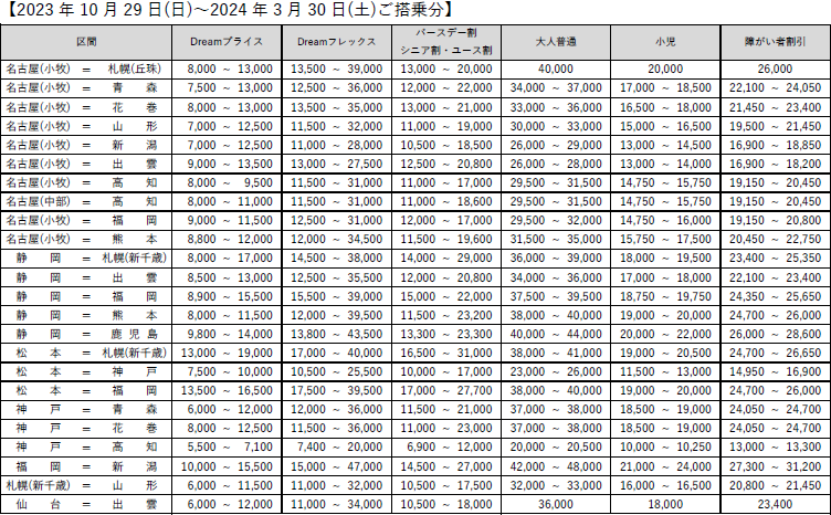 (参考資料)2023年冬ダイヤの各種運賃一覧