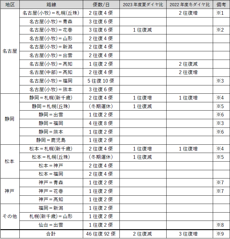 ※9 『神戸=新潟』線(1往復/日)につきましては、2023年8月20日をもって運航を終了いたしました