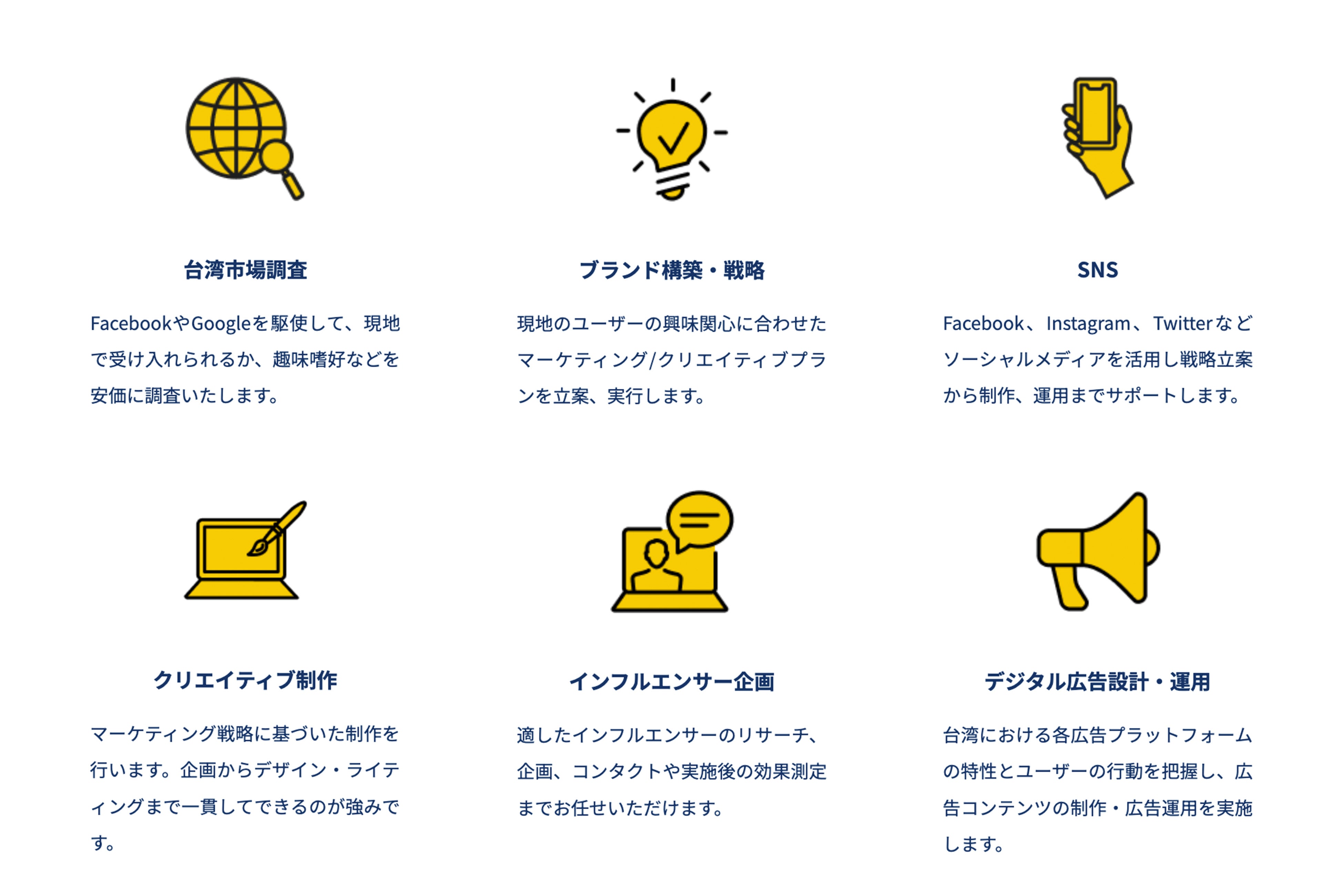 台湾出身のマーケターが、台湾人の好みを踏まえながら日本の高品質な制作水準で、台湾市場に効果的なコンテンツをつくります。台湾のインフルエンサーや台湾現地メディアとのコラボレーション企画なども対応できます。