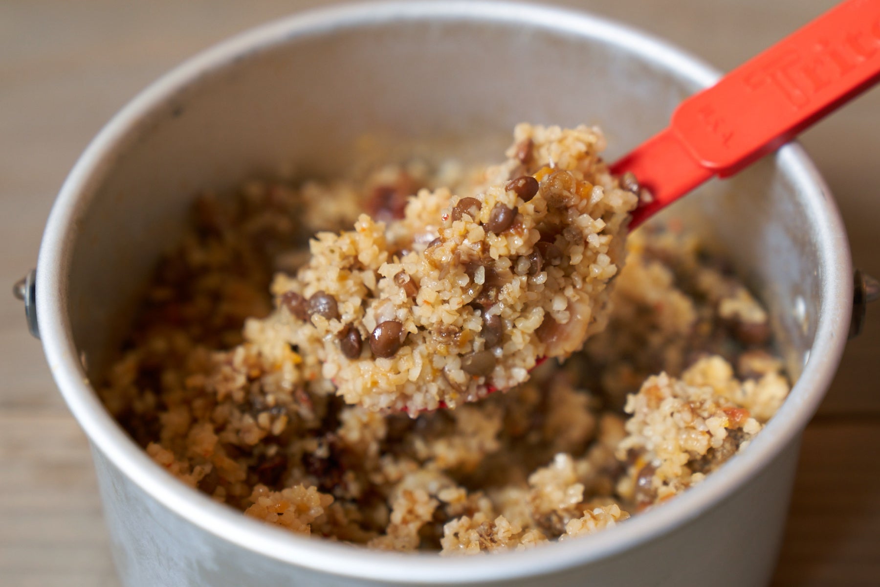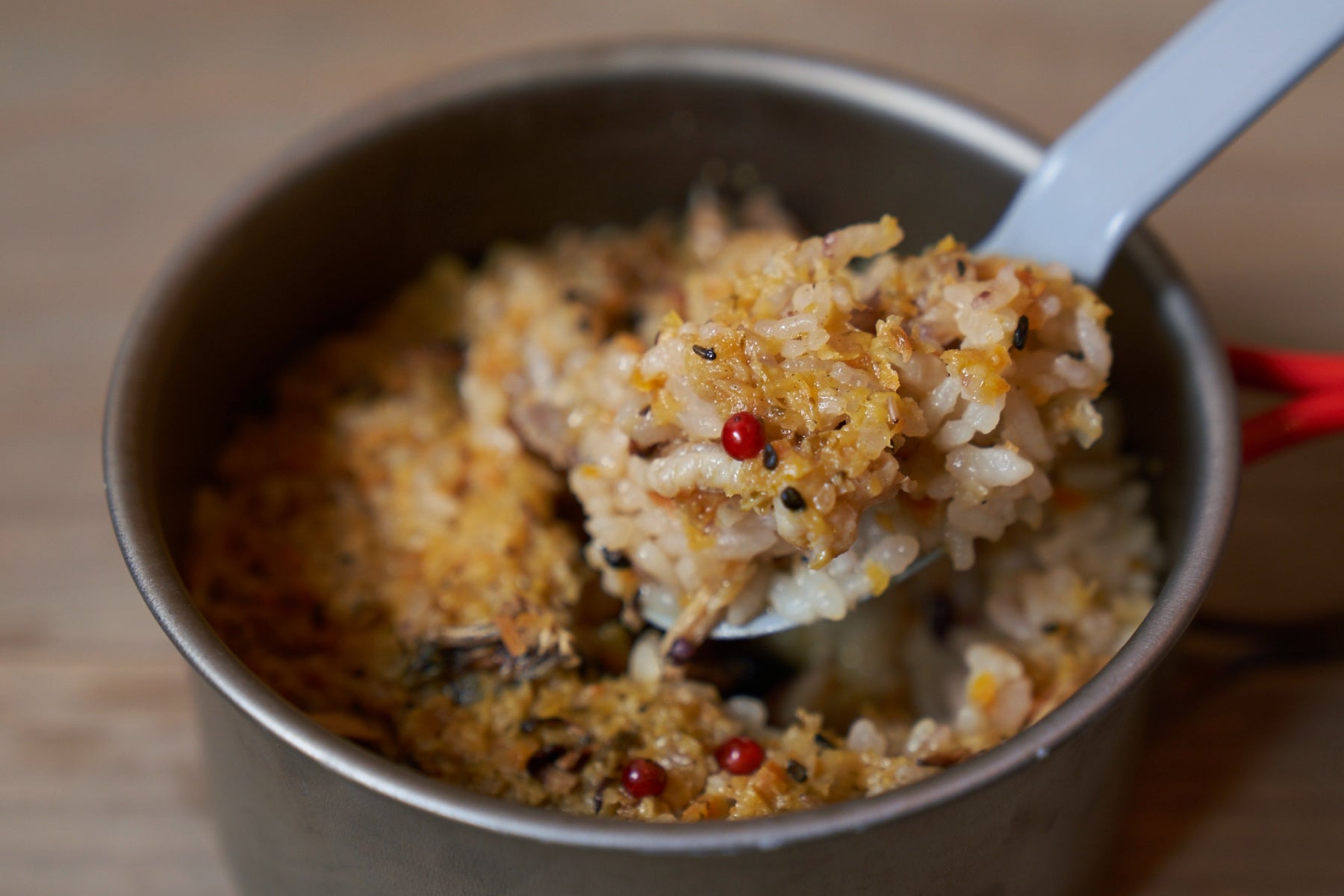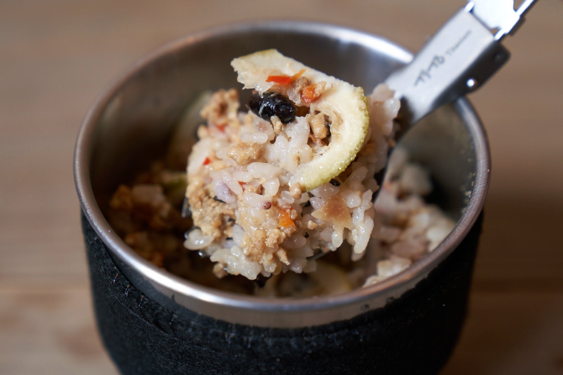 筍と豚の挽肉をベースとしたただただうまいグリーンカレーに、ライムでアクセントを加えています。一口ごとに味と食感が変化し、美味しいと楽しいが同居したようなレシピです。田嶋さんにこれはどこの山を思い浮かべて作りましたか?と聞いたら、行ったことは無いけど屋久島の宮之浦岳っぽい気がする、とのことです。後に宮之浦岳に行って食べてみましたが、エキゾチックさ(樹林帯のダイナミックさ)とシャープさ(山頂付近の抜けた清々しさ)が同居した味はまさに!でした。