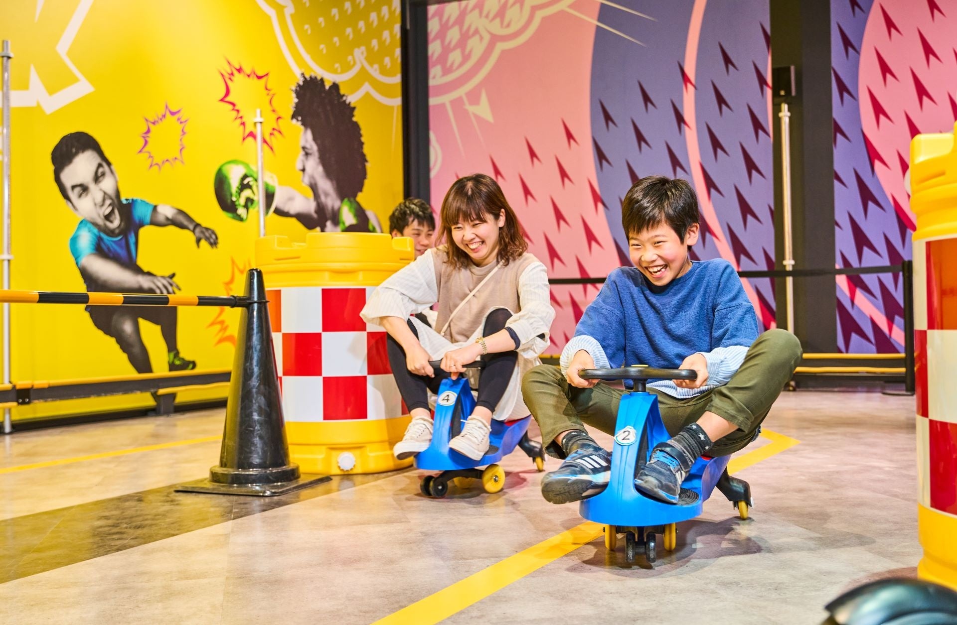 体を動かしながらまるでバラエティ番組に参加しているような体験ができる新感覚のバラエティスポーツ施設です。学生グループやファミリーのお客さまから、「全力ではしゃげる施設」と多くの支持を得ています。