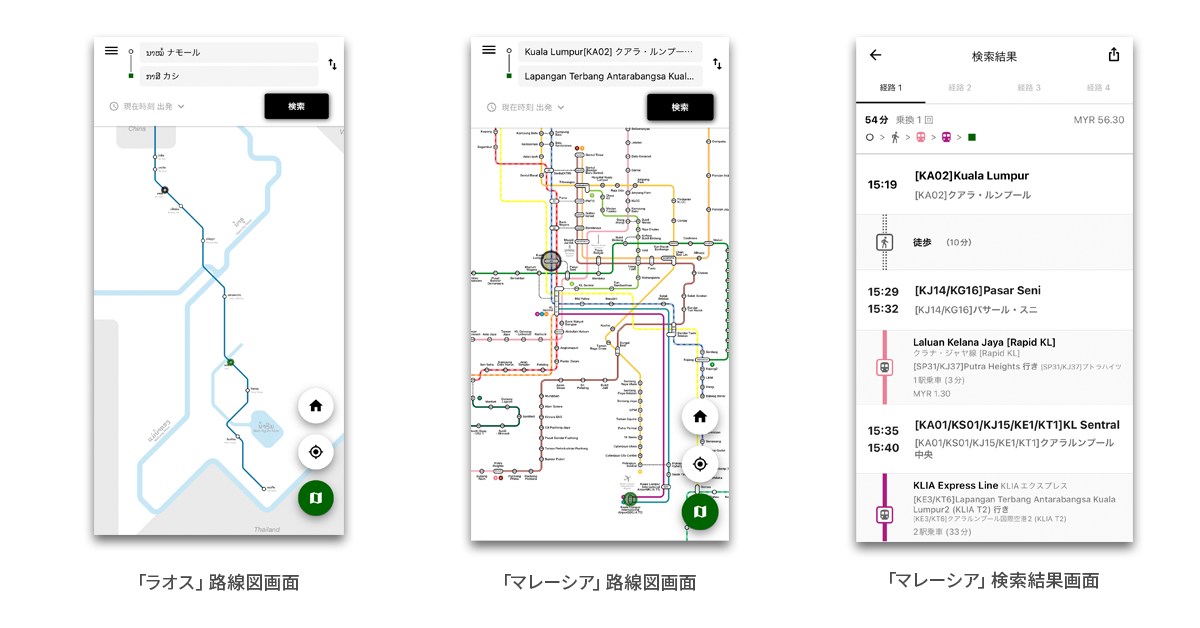 利用者の多い国と地域を見てみると、2019年はマレーシア、日本、台湾、シンガポール、イギリス、韓国でしたが、2023年は、マレーシア、日本、タイ、台湾、シンガポール、韓国とアジア圏のユーザーの割合が増えています。そのため、現在、アジア圏の対応エリアの拡充を進めており、このたび、ラオスの鉄道に対応したことで、東南アジアの鉄道(国内路線)のある9エリア、25社の路線に対応しました。今後も、対応エリアの拡充や、新たに開通する路線への対応を進めてまいります。