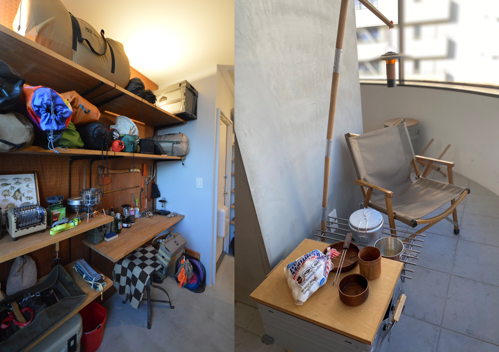 外で使うギアの収納やメンテナンス作業に最適な土間スペース、お気に入りのギアを飾りながら収納できる有孔ボード、インナーバルコニーの活用など、ギアの多いキャンプ好きに嬉しいリノベーションのアイデアを散りばめた住まいを体感いただけます。