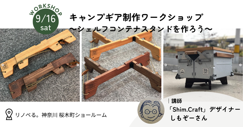 2023年8月24日(木)から9月18日(月・祝)の期間中、「リノベる。神奈川 桜木町ショールーム」にてキャンパーが暮らす一室を再現し、各種イベントを開催します。ショールームでは、外で使うギアの収納やメンテナンス作業に最適な土間スペースや、お気に入りのギアを飾りながら収納できる有孔ボード、インナーバルコニーの活用など、ギアの多いキャンプ好きに嬉しいリノベーションのアイデアを散りばめた住まいを体感いただけます。同時期に、入手困難なガレージブランド「Shim.Craft(シムクラフト)」の製品をショールーム内にスタイリングします。期間中は予約制でショールームの見学に加え、アウトドア好きのための『中古を買ってリノベーション』相談会を受け付けます。また、9月16日(土)には「Shim.Craft」のデザイナー、しもぞーさんを講師にお呼びし、1日限定で「キャンプギア制作ワークショップ~シェルフコンテナスタンドを作ろう~」を開催します。