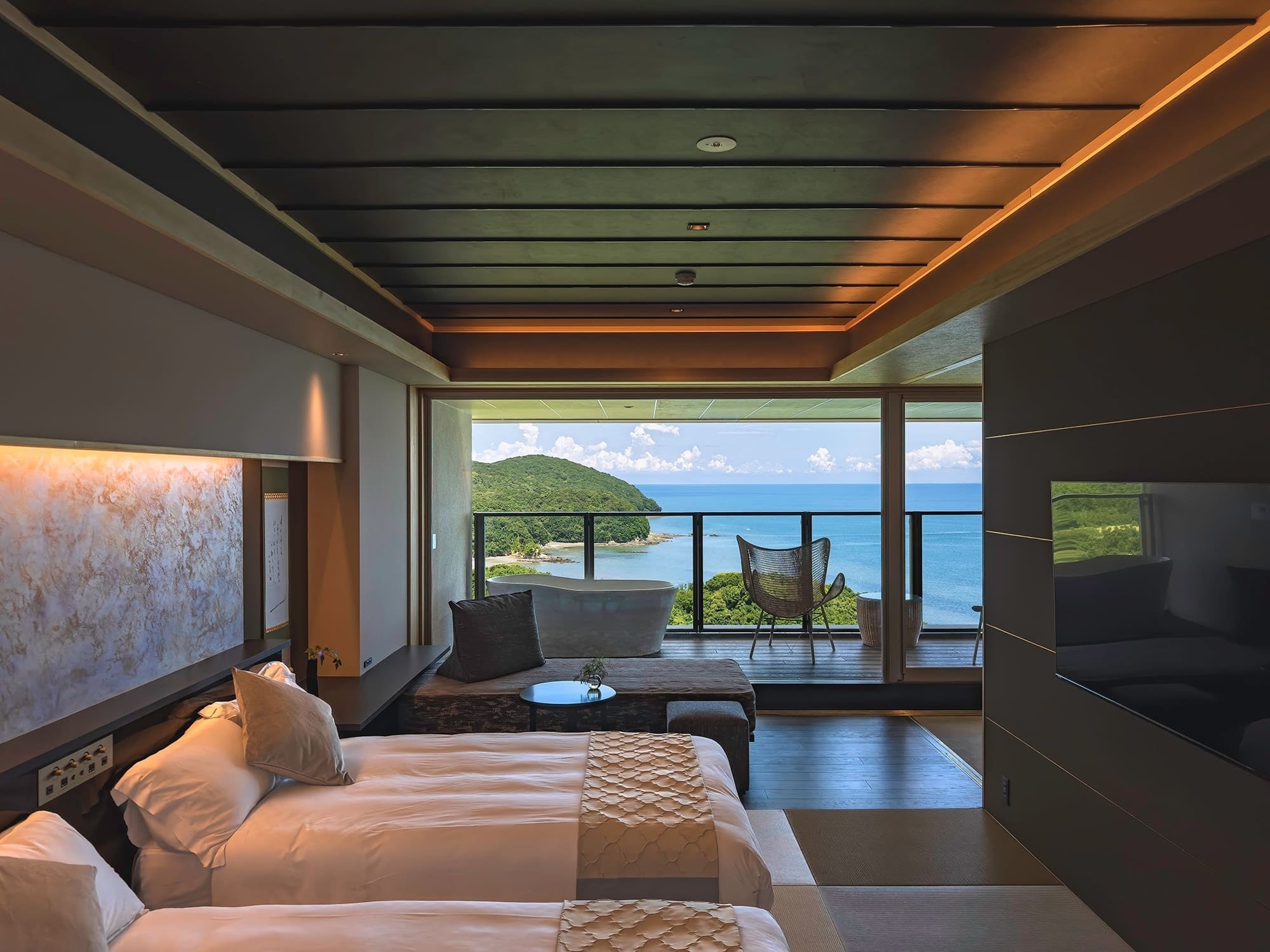 新客室からは、伊勢湾に浮かぶ飛島を一望する絶景をお楽しみいただけます。