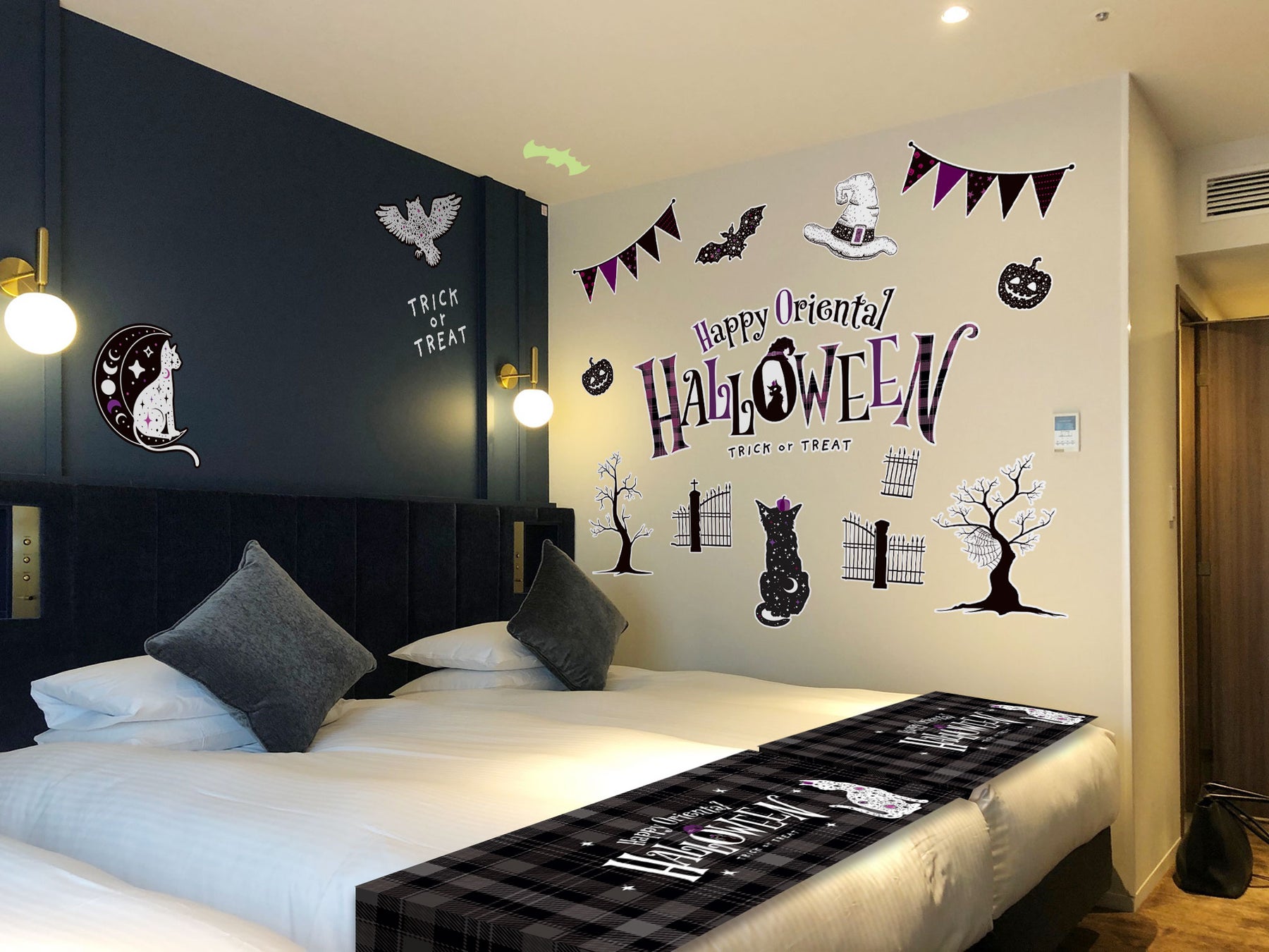 本コンセプトルームは、8月1日にリニューアルしたThe Oriental Floorの「オリエンタル・デラックス」(42㎡)2室と、「オリエンタル・コンフォート」(25㎡)4室の計6室限定です。「オリ猫」などさまざまなハロウィーンモチーフで、テーブルやベッドのフットスロー、洗面室など客室全体をデコレーション。ハロウィーン気分を盛り上げる大人っぽい雰囲気の客室で、とっておきのハロウィーンステイをお過ごしいただけます。