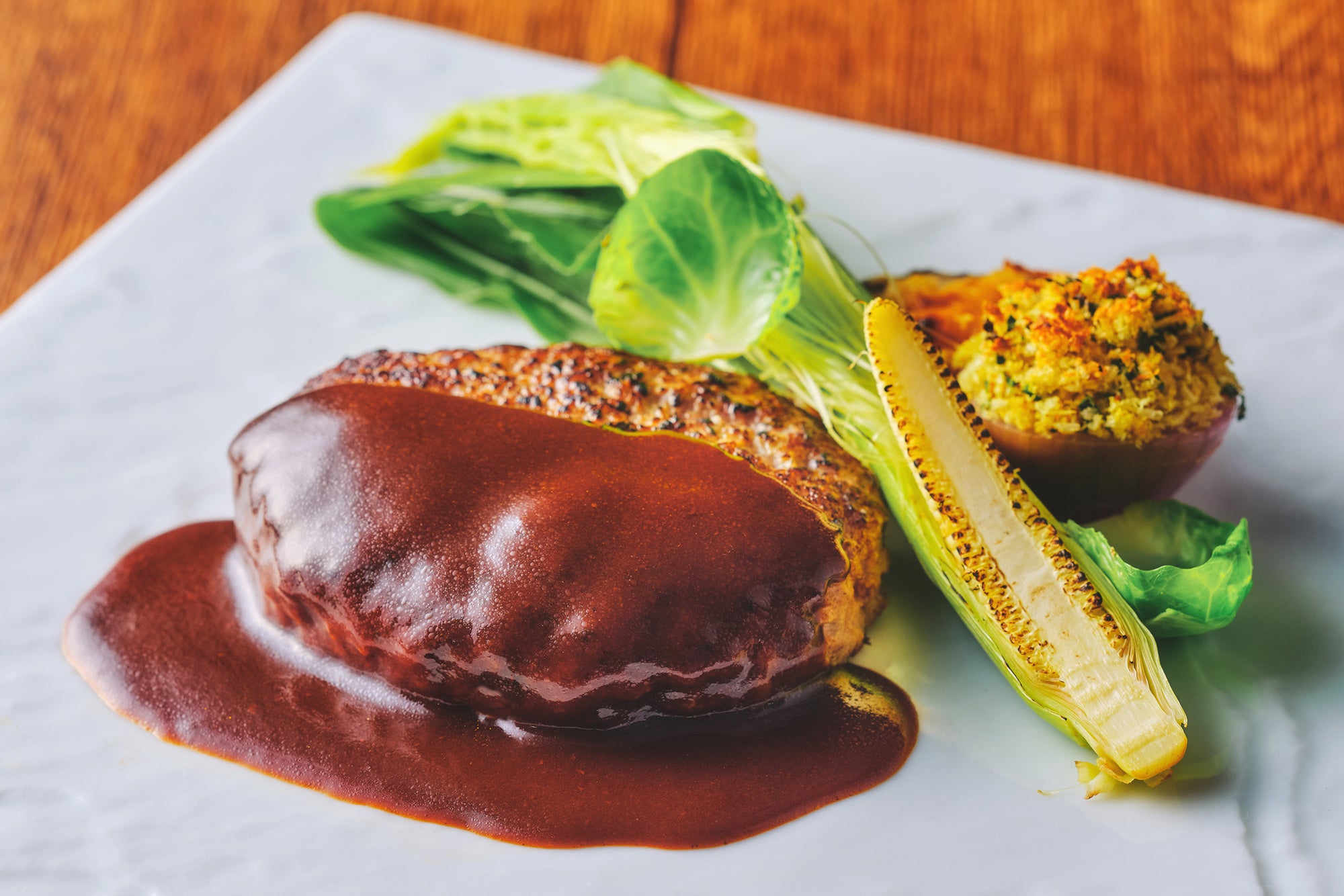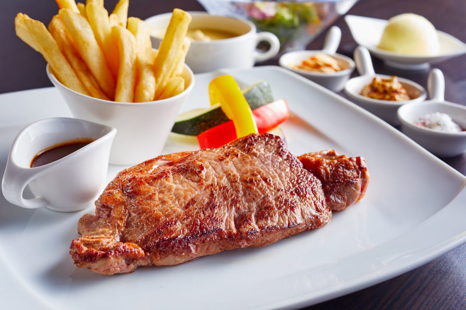 サーロインステーキ / ハンバーグステーキ / 有頭海老フライ / 鯛のポワレと海老のポッシェ / 和牛ロースステーキ +1,000円 (いずれもパンまたはライス付き)