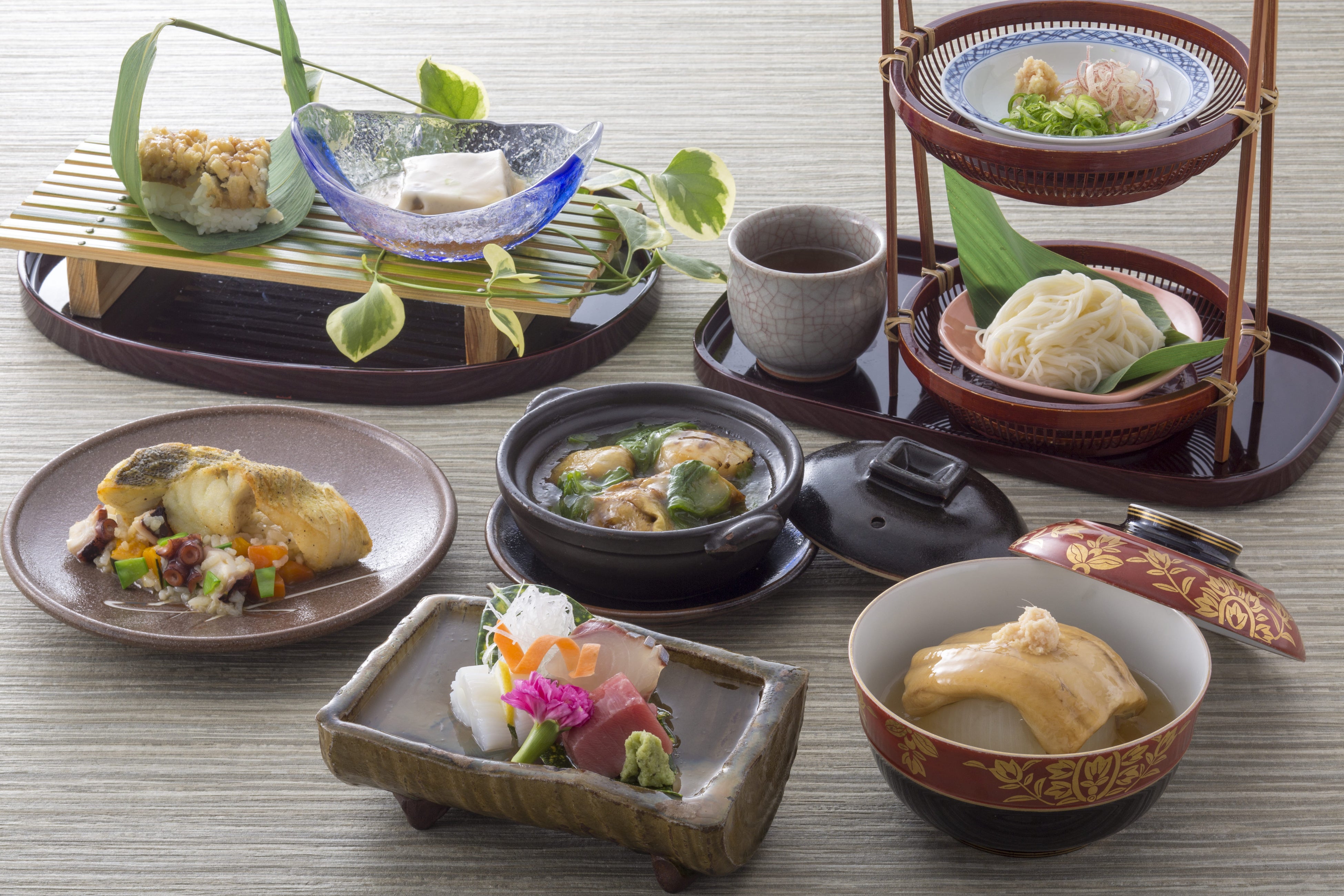 鱧、鰆、穴子、蛸など、明石・淡路・瀬戸内で揚がった旬魚介と、県産の旬菜を主軸とした会席料理。ぷりぷりの旬魚造りのほか、丸ナスと淡路レタスを帆立とともに餡かけにした椀代わりの小鍋、明石蛸入りリゾットを添えた鱸の焼物、丸ごと淡路玉葱と煮穴子の煮物など、端正かつ滋味溢れる料理が続々と。食事は丹波黒豆ご飯か揖保乃糸からお選びいただけます。