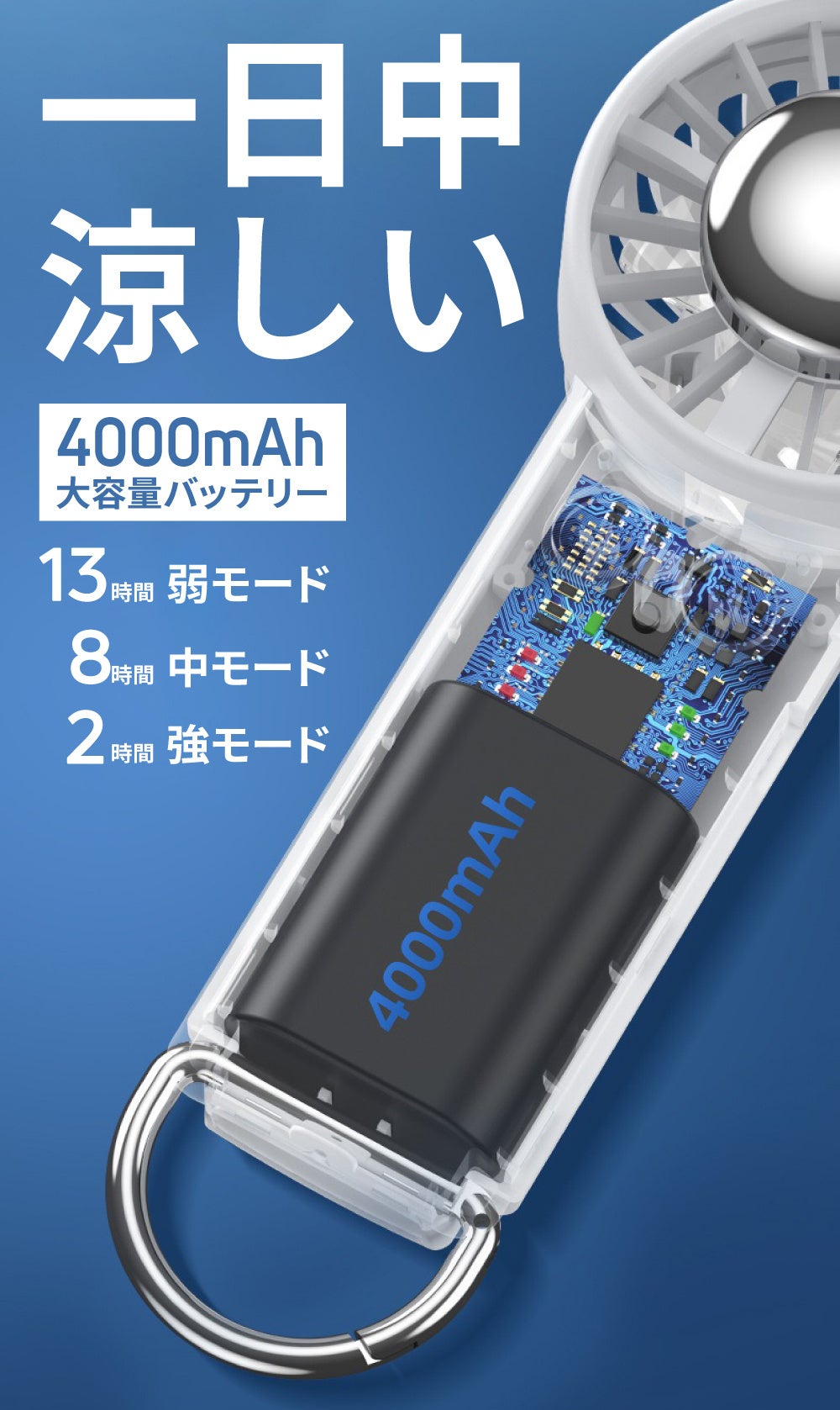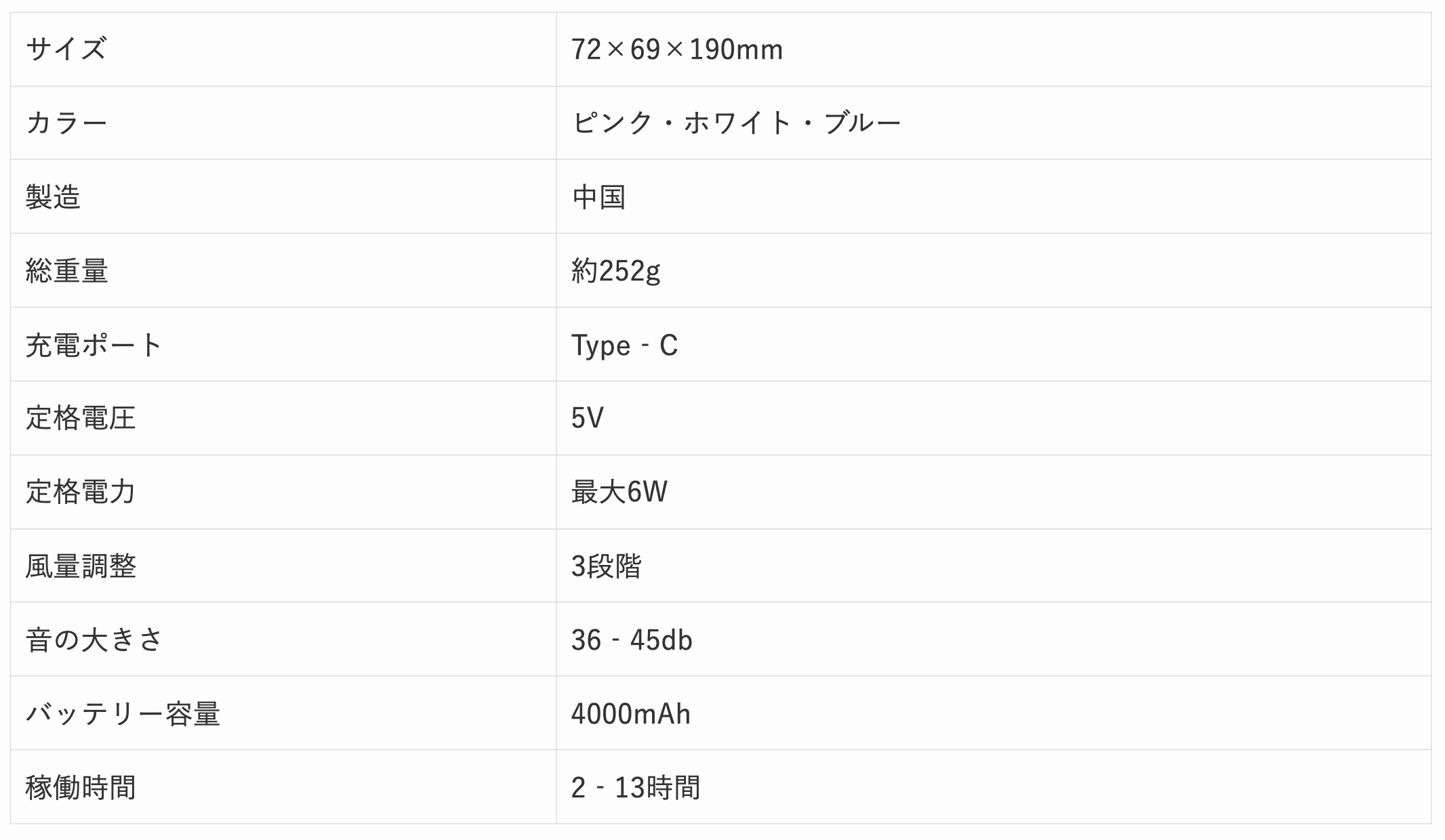風量のレベルによって最大使用できる時間が異なりますが、フル充電で使用すると約2時間〜13時間の使用ができるようになります。
