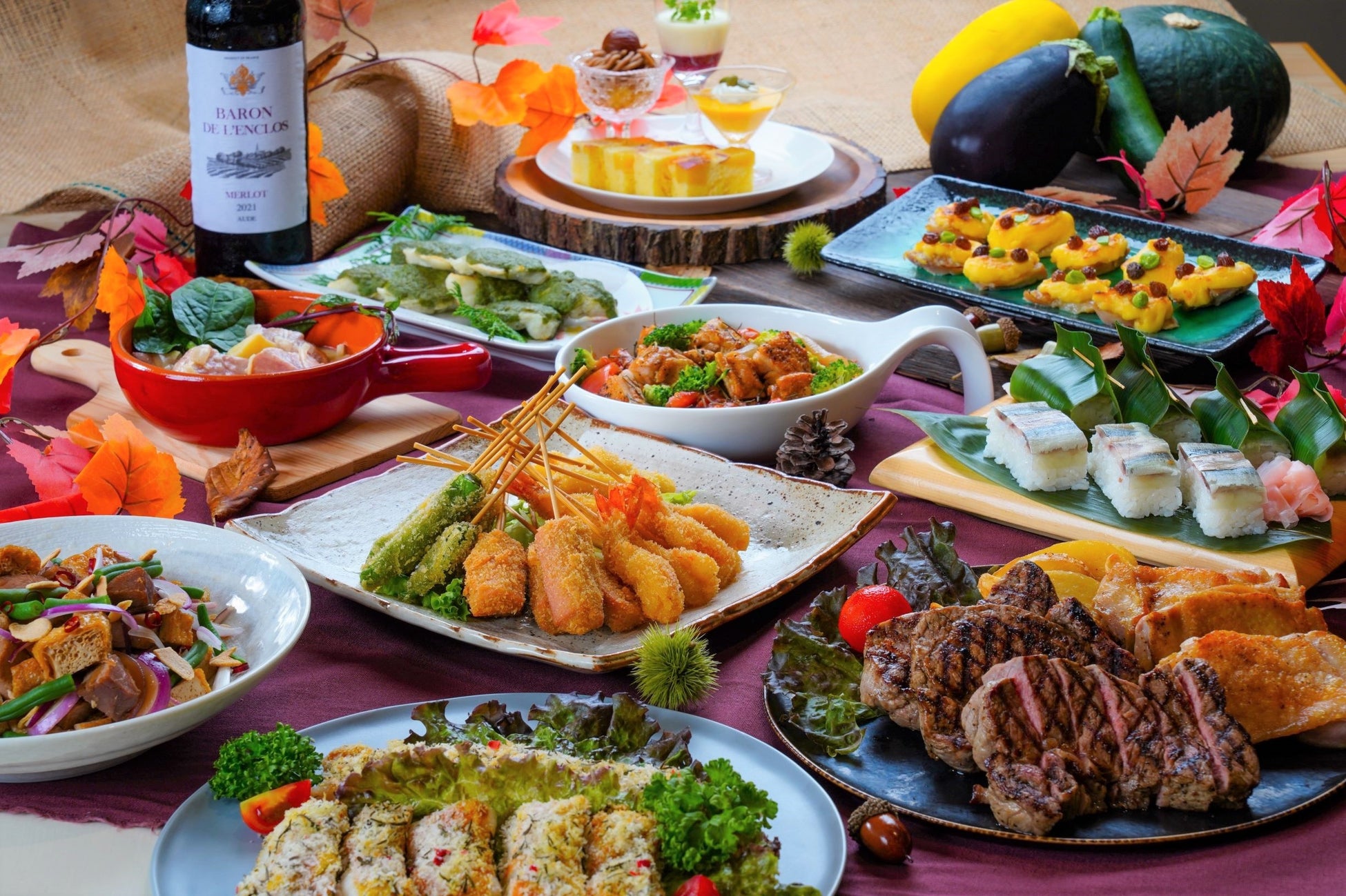 本ブッフェは、サーロインステーキ食べ放題コース、またはチキンステーキ食べ放題コースの2種類からお選びいただき、共通メニューは、秋を代表する食材をふんだんに使用いたします。