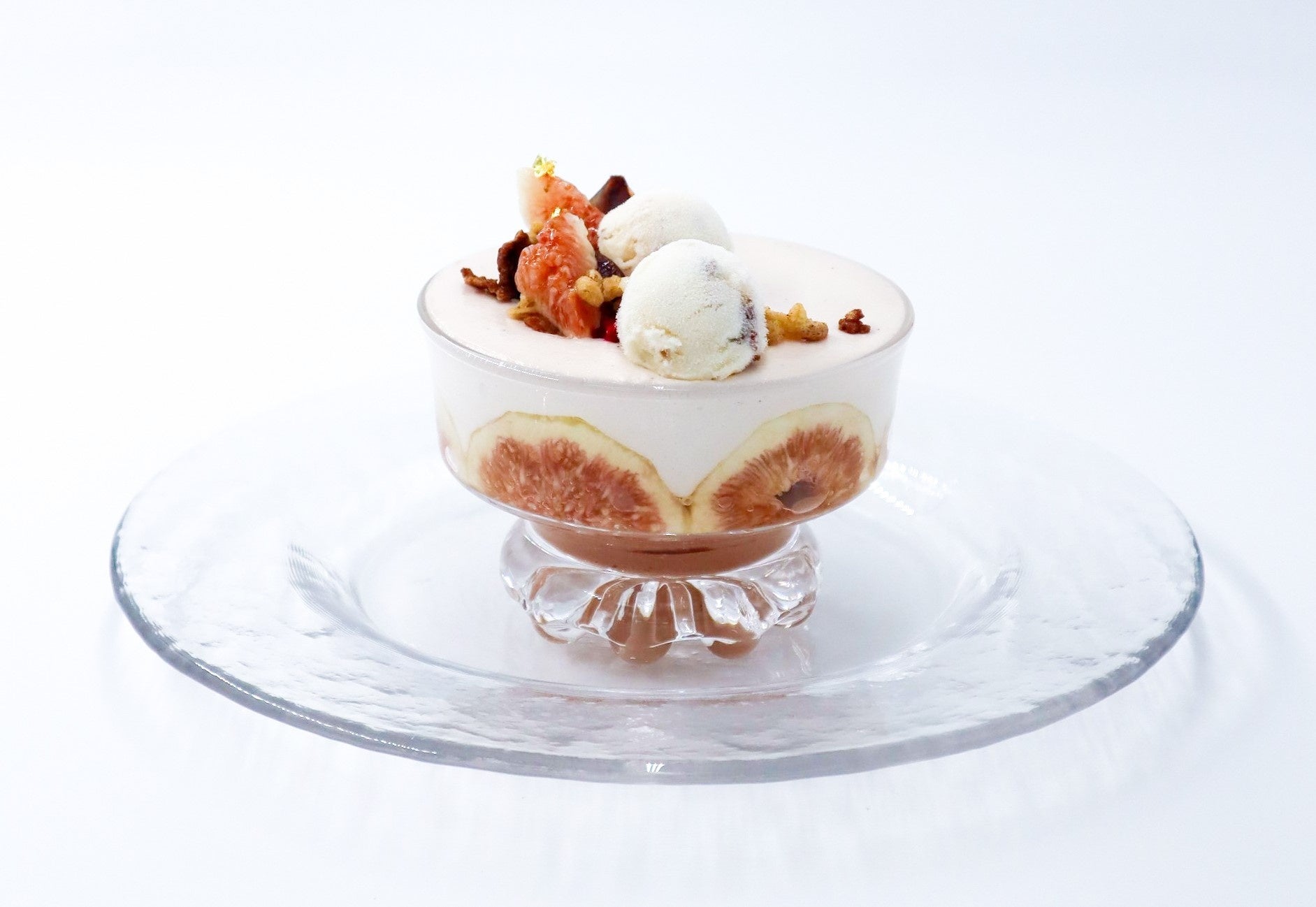 いちじくと相性の良い紅茶「アールグレイ」のジュレ、チョコレートクランチ、マスカルポーネクリームを組み合わせました。甘酸っぱいブルーベリージャムとフランボワーズを忍ばせ、アクセントに栗・ラムレーズンのミルクジェラートをトッピング。食べ進めるごとに変化する食感や味わいをお楽しみください。
