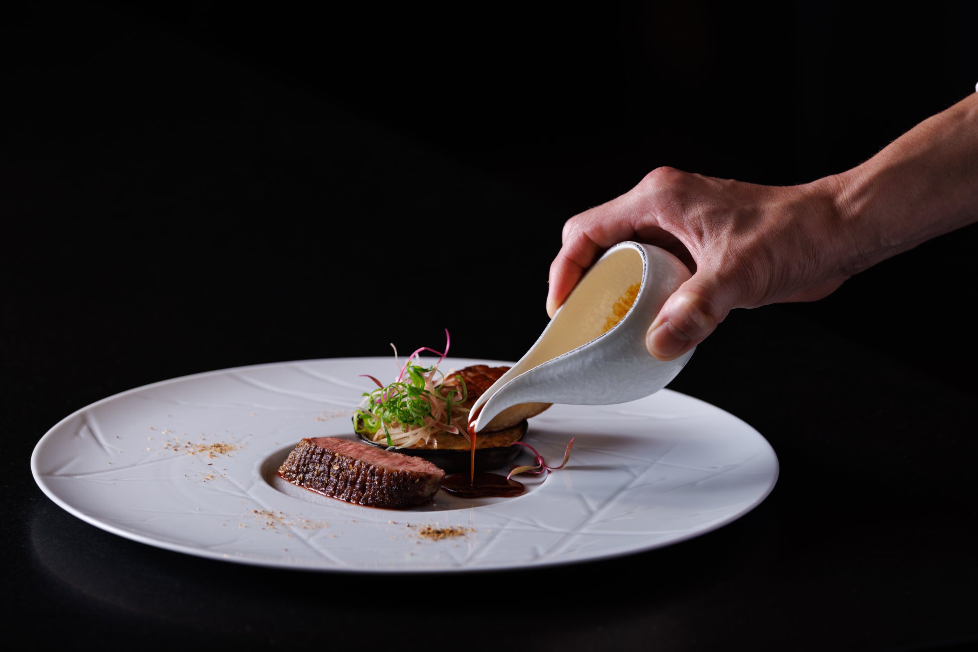 「自然・芸術・料理」をモチーフに、本阿弥光悦の琳派から着想を得て、型にはまらない美しさを追求したフレンチをご提供するレストラン「TENJIN」。店内は「シェフズテーブル」「オールデイダイニング」「ザ バー」と3つのシーンに分かれており、それぞれお客様のスタイルや用途によってお選びいただけます。テラスに面した「Engawa」やテラス席のすぐ下には天神川が流れ、川のせせらぎを聴くとともに、青もみじや紅葉、蛍など四季の移ろいを感じることができます。