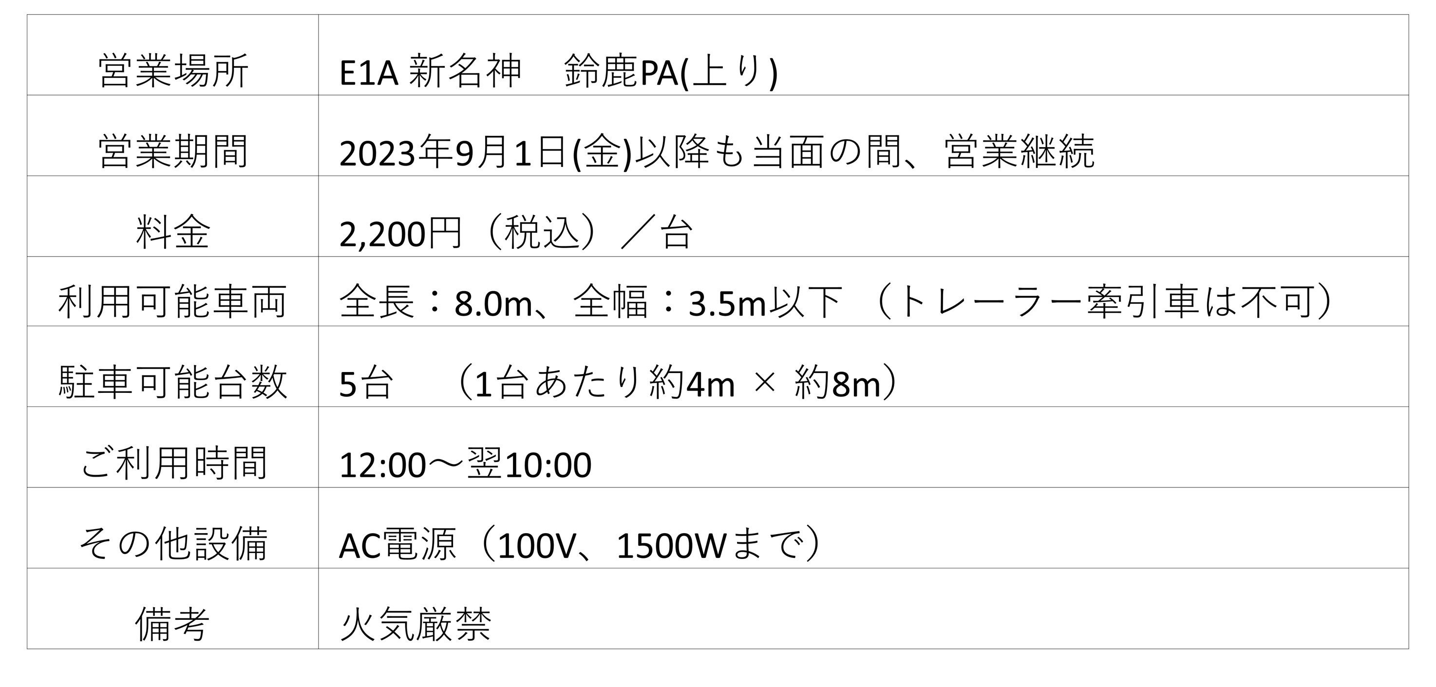 NEXCO中日本(本社・名古屋市中区、代表取締役社長CEO・小室(こむろ)俊二(としじ))、中日本エクシス株式会社(本社・名古屋市中区、代表取締役社長・三宅(みやけ)広通(ひろみち))、およびCarstay(カーステイ)株式会社(本社・神奈川県横浜市、代表取締役・宮下(みやした)晃樹(こうき))は、E1A 新名神高速道路(新名神) 鈴鹿パーキングエリア(PA)(上り、三重県鈴鹿市)の駐車場に直結する「RVステーション鈴鹿PA」(以下「当ステーション」)の営業期間を2023年9月1日(金)以降も当面の間、延長します。
