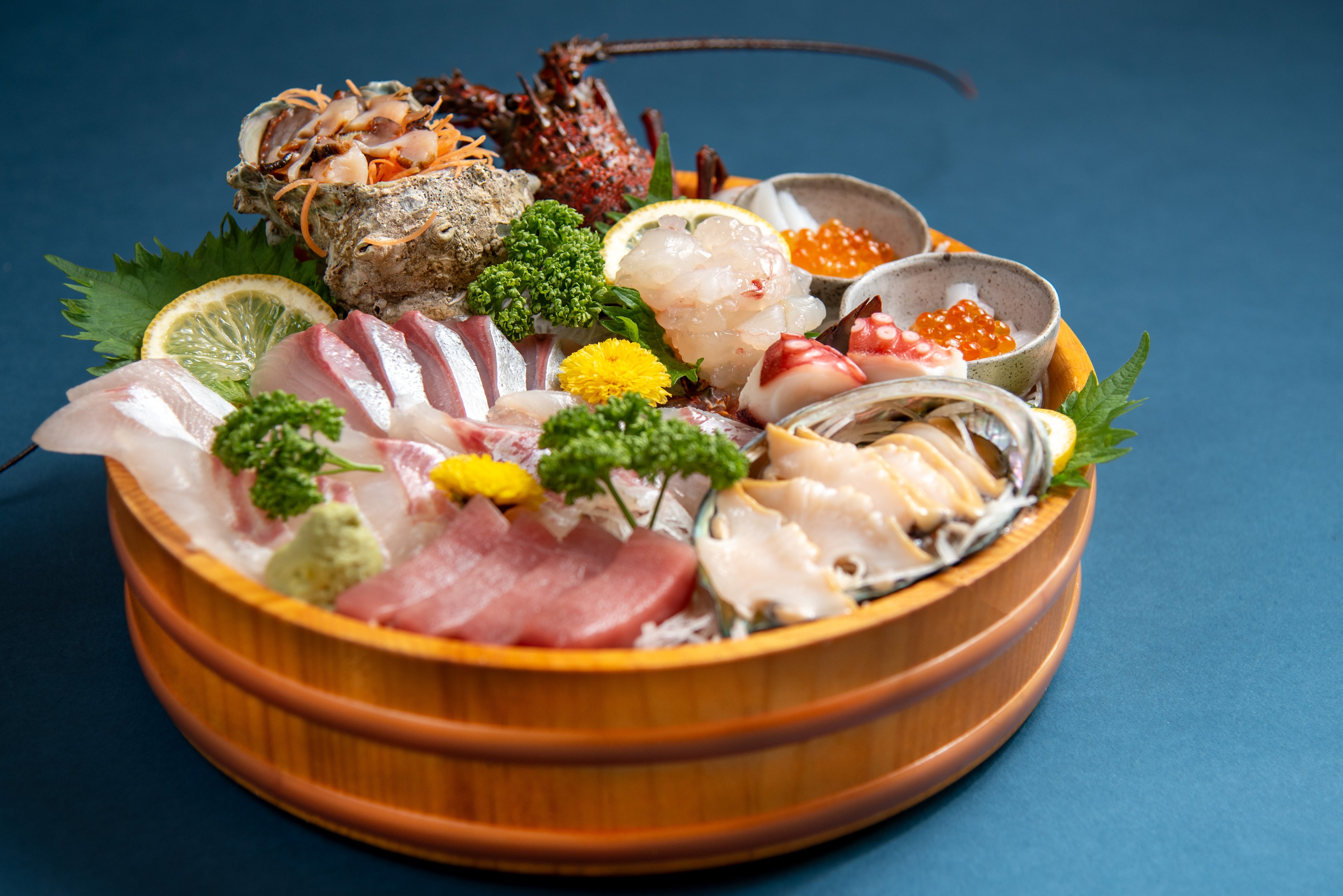 特にお造りの桶盛りは、ここでしか楽しめないボリューム(写真で2名様盛り)。三重県の銘酒と合わせて最高のマリアージュをお楽しみください。
