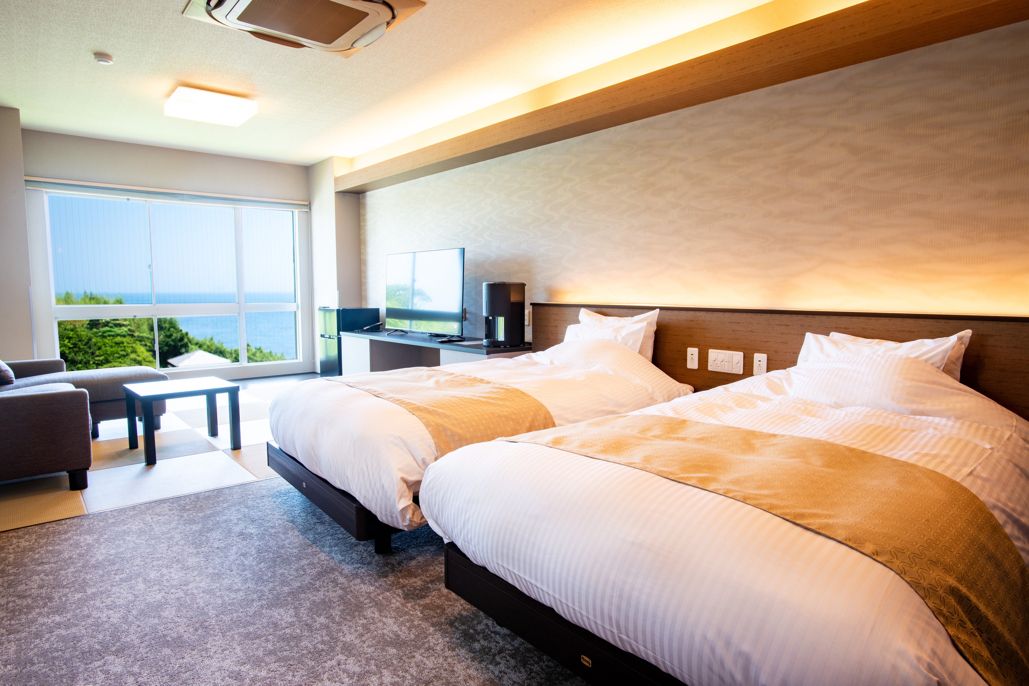 客室も2023年2月にリニューアルしたばかり。プライベートサウナ付き客室では、サウナで必要な水分補給ができるようにウォーターサーバーを完備。シモンズ社製のベッドのため、ととのった後にはぐっすりと眠ることができます。お部屋からは伊勢志摩の自然をご覧いただけます。