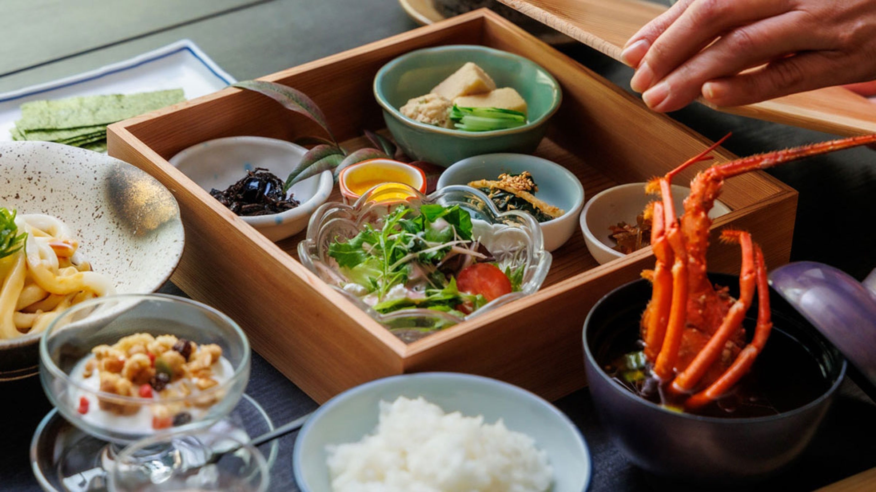 朝食はお腹をととのえるための、女将特製の「TOTONOE朝食」。お腹にやさしい伊勢うどんや、丁寧に作られた小鉢、スムージーまたはお酢ドリンクなどをご用意しています。