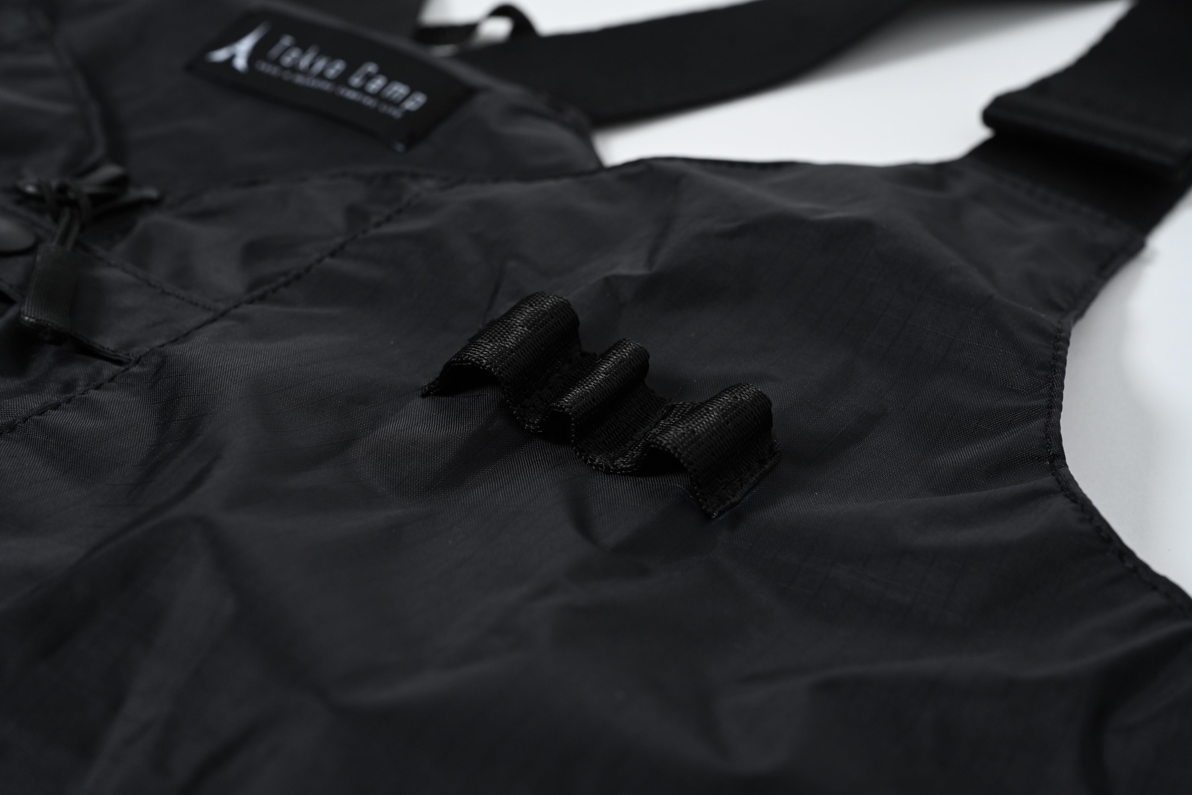 フロントにある2つのポケットには収納物の落下を防ぐスナップボタンが付いています。左胸部にはサングラスやキャンプギアを掛けられるギアループ、右下腹部には留め具の付いたDカンが備えられています。また、ショルダーベルト付きでお好みのスタイルに合わせて調整いただけます。アウトドアシーンはもちろん、普段使いとしても合わせやすい汎用性の高いアイテムです。