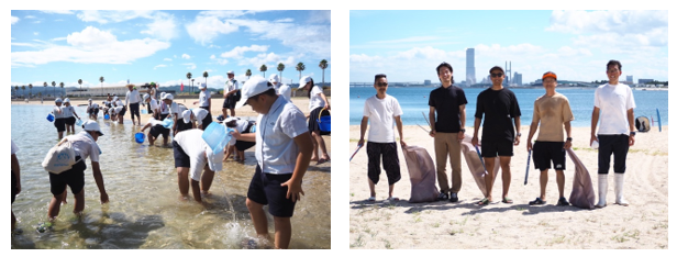 また、海底調査・海底清掃の翌日には、タルイサザンビーチにて海岸清掃も行ったほか、地元の漁師の皆さんも参加し、ヒラメの稚魚を地元の小学生が放流する課外授業の運営もサポート(写真左)。子どもたちからは「ヒラメが泳いでいくのを見て、楽しかった」「大きくなってほしい」などの声があがるなど、楽しみながら海や魚に親しむ様子が伺えました。そのほか、タルイサザンビーチのビーチクリーンも実施(写真右)、プラスチックごみなどを多く回収しました。