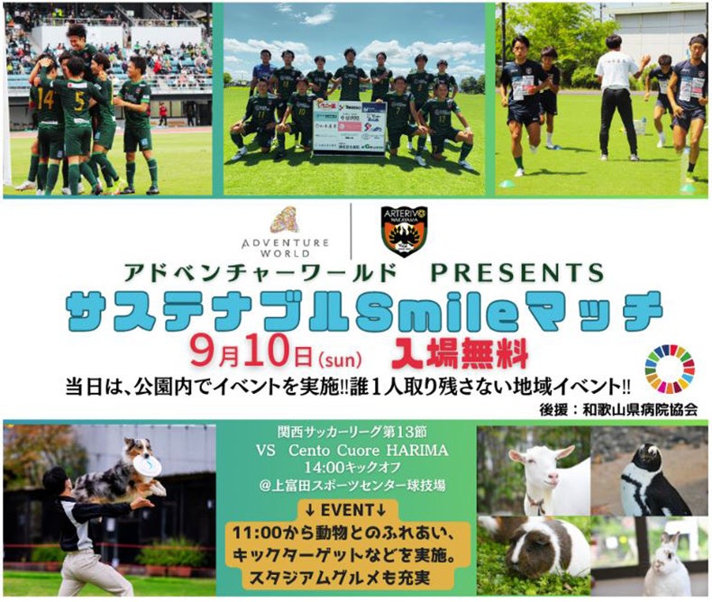 アドベンチャーワールド(和歌山県白浜町)は、和歌山県からJリーグ入りを目指す「アルテリーヴォ和歌山」が推進する、スポーツを通したまちづくりや、人々の心を動かし、和歌山に「夢・感動・活力」を提供し続けるという理念に共感し、2023年9月10日(日)開催の「アルテリーヴォ和歌山」が出場する関西サッカーリーグの試合に冠スポンサーとして協賛いたします。また、試合当日は選手によるサッカー教室や、アドベンチャーワールドの動物たちとのふれあい、地元地域のキッチンカー出店など楽しいイベントをたくさんご用意いたします。